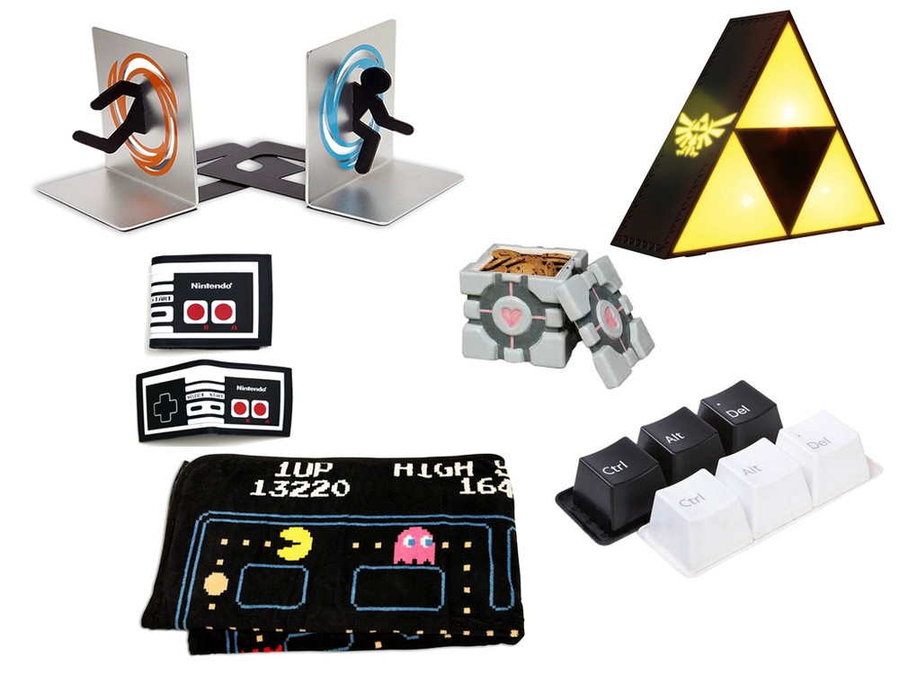 Ненужный хлам не тот случай и нужно что-то действенное, простое и недорогое? Самое время перейти к стильным вещам, которые могут выполнять несколько функций сразу. Подарите всеми известный набор стаканов Ctrl+Alt+Del. Лично у меня прям точно такой же, но, по правде говоря, пить из них совершенно неудобно, и выполняют они функцию либо хранения мелочи либо, в перевёрнутом виде, как элемент дизайна. Вторая не менее эффектная и полезная вещь - это держатели для книг в стиле Portal. А далее по нарастающей: куб из Portal для хранения печенья, плед Pacman, Triforce лампа из Zelda, кошелёк в виде джойстика. Что уж говорить о незаменимых кружках, которые можно купить готовые или же заказать с любой картинкой в местной типографии.