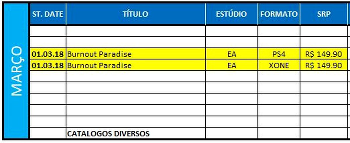 Судя по изображению, опубликованному GamePress, ремастеры Burnout Paradise для PlayStation 4 и Xbox One могут быть выпущены 1 марта 2018 года. Игры якобы планируется продавать по 150 бразильских реалов - это около $45.