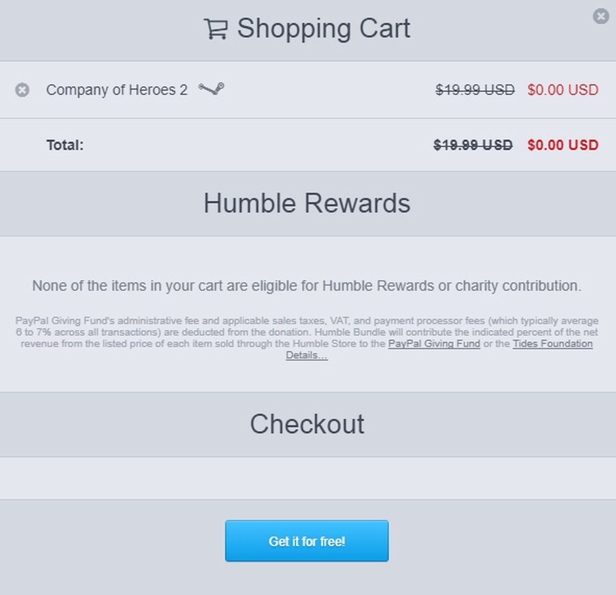 Алгоритм получения кода Company of Heroes 2 для активации в Steam стандартный. Сначала зайдите на страницу игры в Humble Bundle и добавьте ее в корзину. Теперь откройте корзину и, ничего не заполняя, кликните по кнопке "Get it for free".