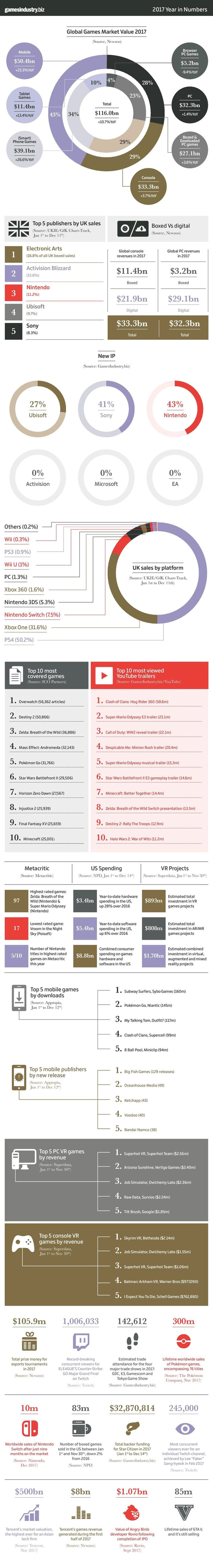 Каких результатов достигла игровая индустрия в 2017 году? У редакции GamesIndustry есть ответ. Журналисты обработали внушительный массив данных и выпустили инфографику с главными показателями игровой индустрии за этот год.