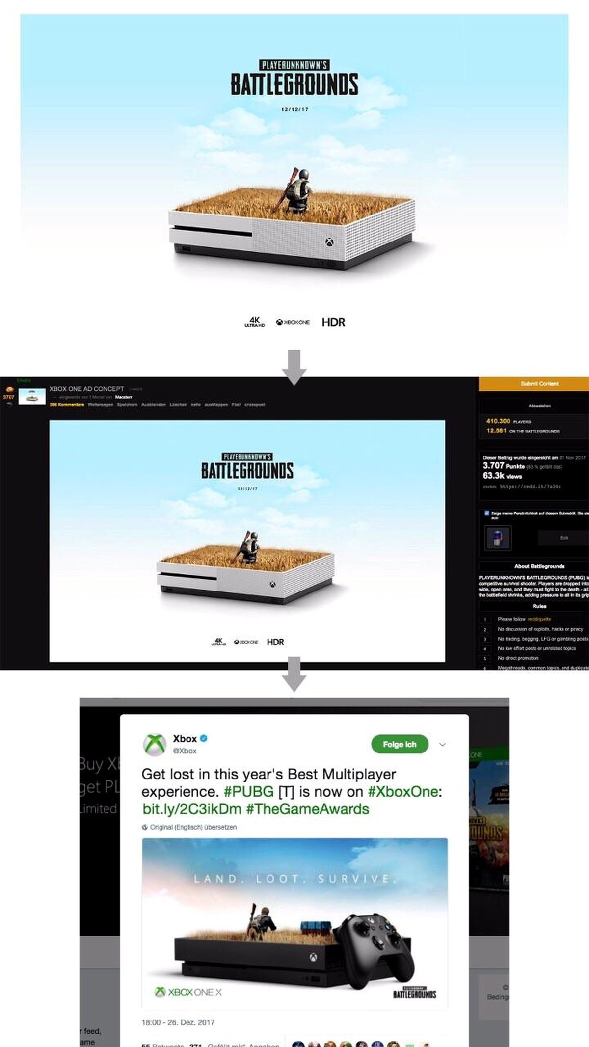 Коротко напомним, в чем суть дела. Около месяца назад пользователь Reddit Macsterr показал, как мог бы выглядеть рекламный баннер Playerunknowns Battlegrounds и Xbox One. Сегодня официальный аккаунт Xbox в твиттере опубликовал промо-изображение, очень похожее на работу Macsterr. Сейчас этот твит уже удален.