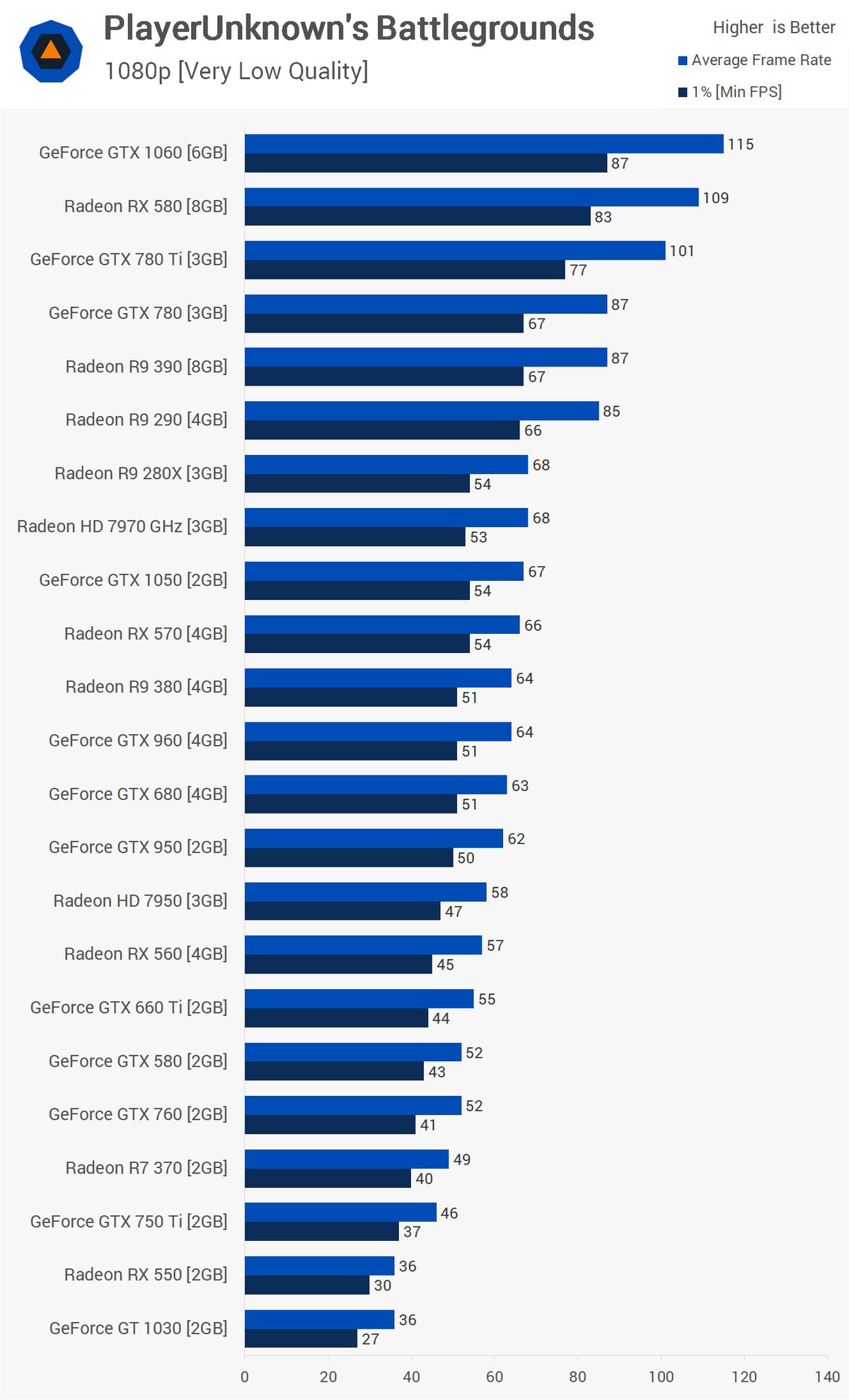 Оказалось, что для более-менее комфортной игры в PUBG на минимальных настройках графики при разрешении 1080p вполне хватит видеокарт уровня AMD Radeon RX 550 или Nvidia GeForce GT 1030. Обе этих карты выдают около 30 кадров в секунду (в случае GT 1030 - чуть меньше 30): играть можно, но красотами вы точно не насладитесь.