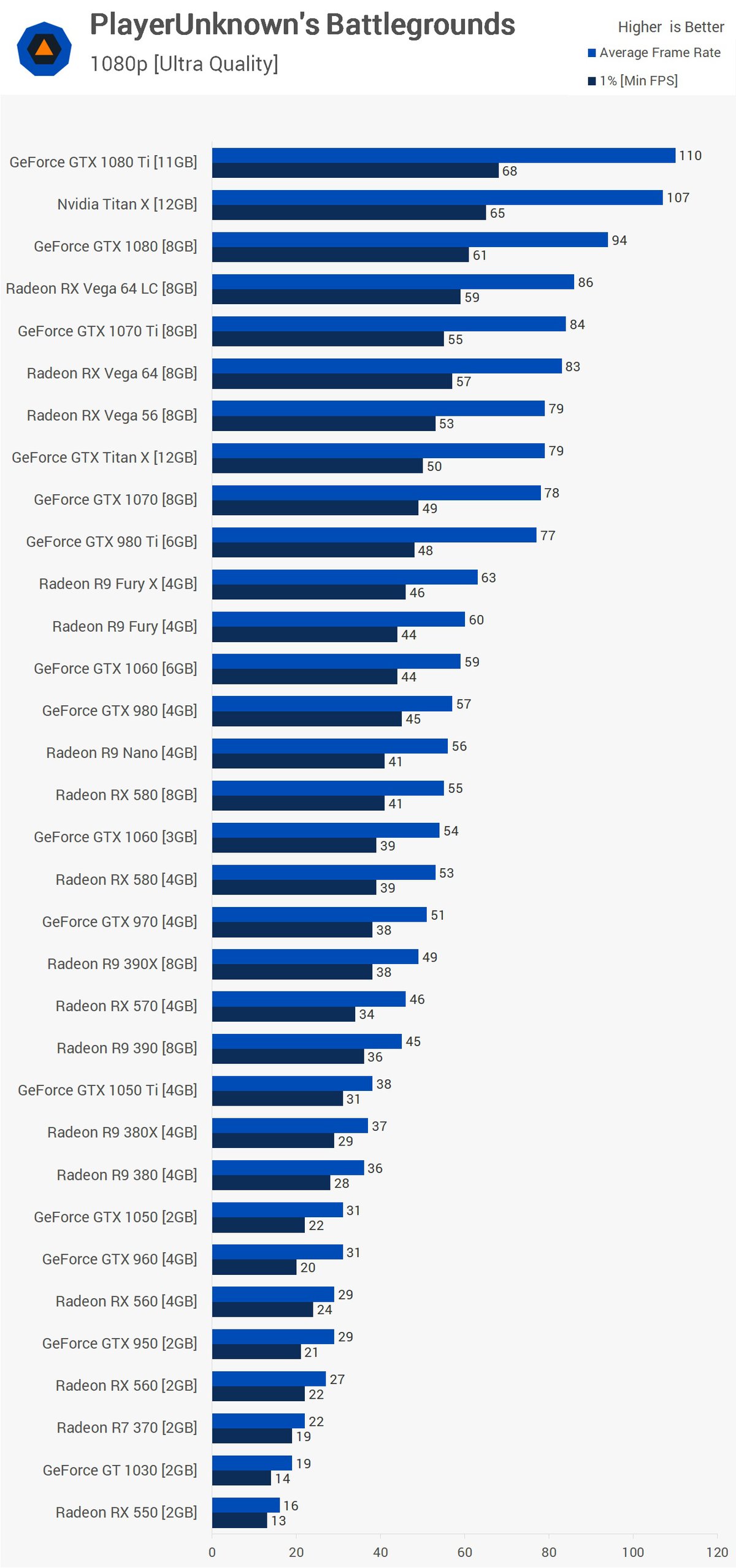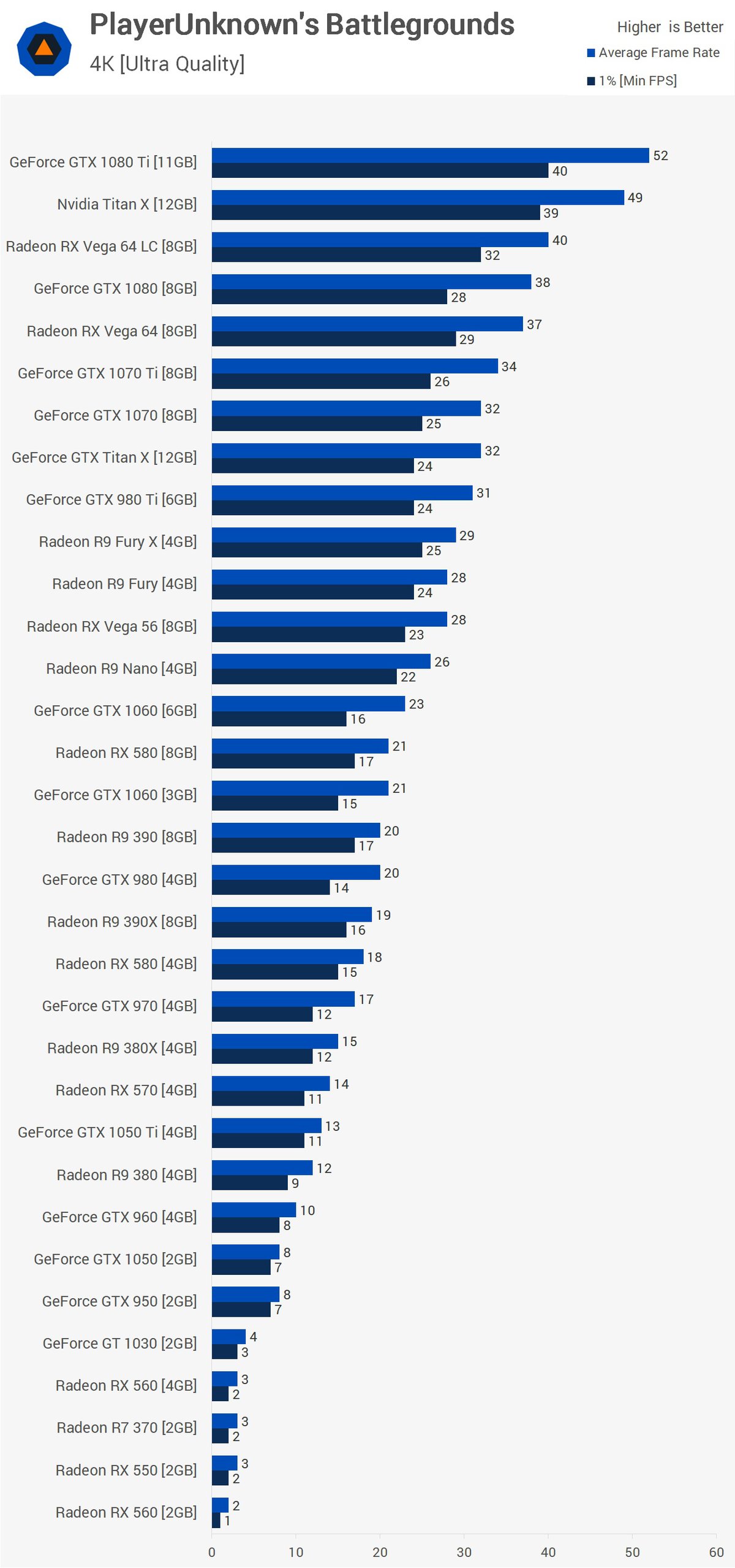 Владельцам больших мониторов придется раскошелиться. Если в разрешении 1440p стабильные 30 кадров в секунду обеспечит что-то уровня GeForce GTX 1060 или Radeon RX 580, то для игры в PlayerUnknowns Battlegrounds с разрешением 4К вам понадобится GeForce GTX 1080, Radeon RX Vega 64 или GeForce GTX 1070 Ti.