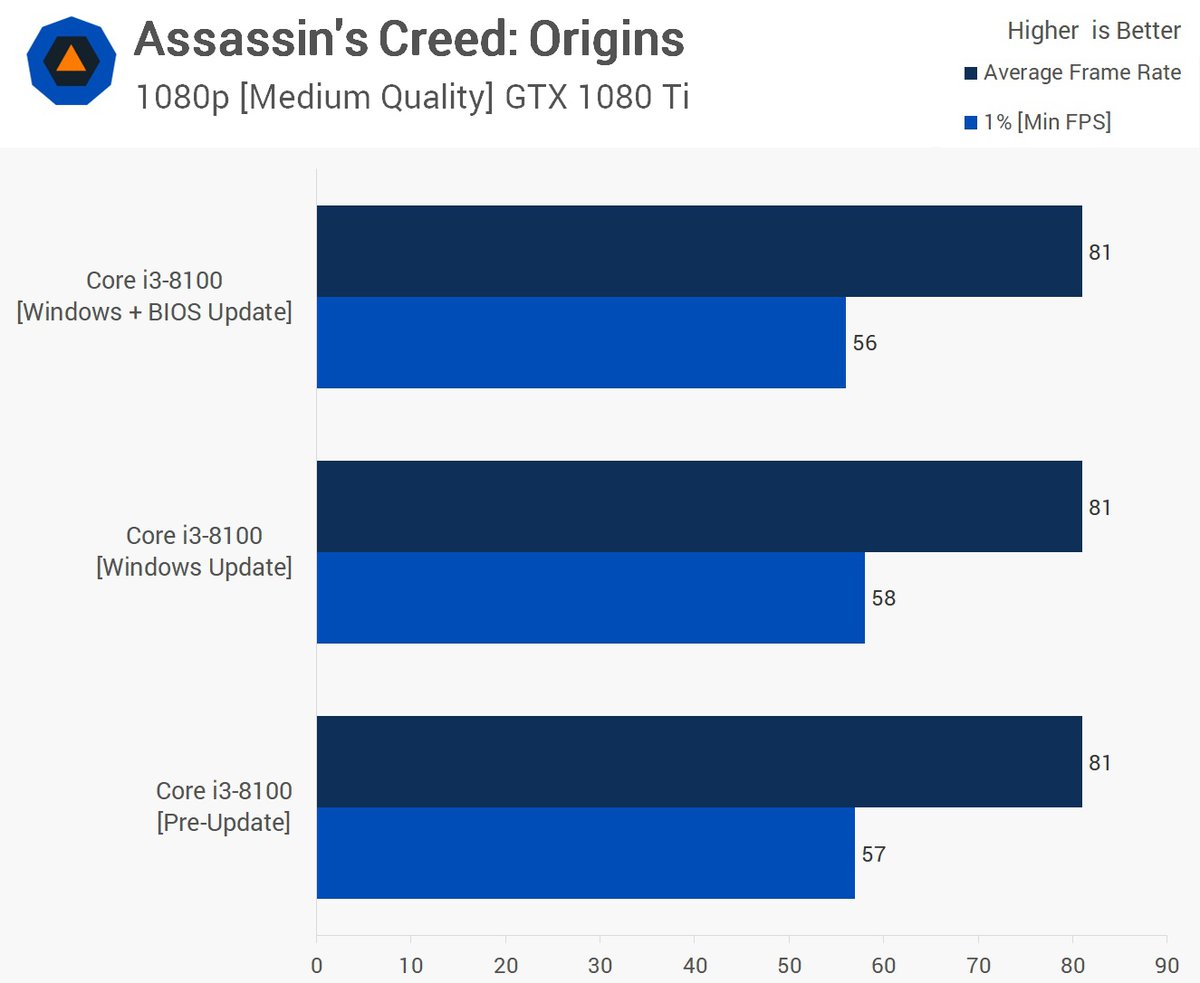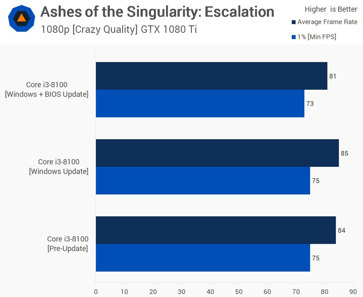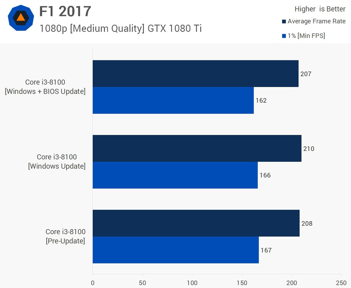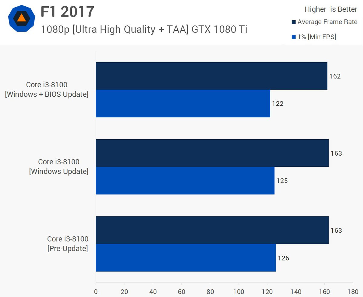 Журналисты взяли операционную систему Windows 10, не самый мощный процессор Intel Core i3-8100, снабдили его видеокартой Nvidia GeForce GTX 1080 Ti и сравнили производительность получившейся конфигурации в трех сценариях: без обновлений; с обновлением для Windows; с новой версией BIOS плюс обновление для Windows.