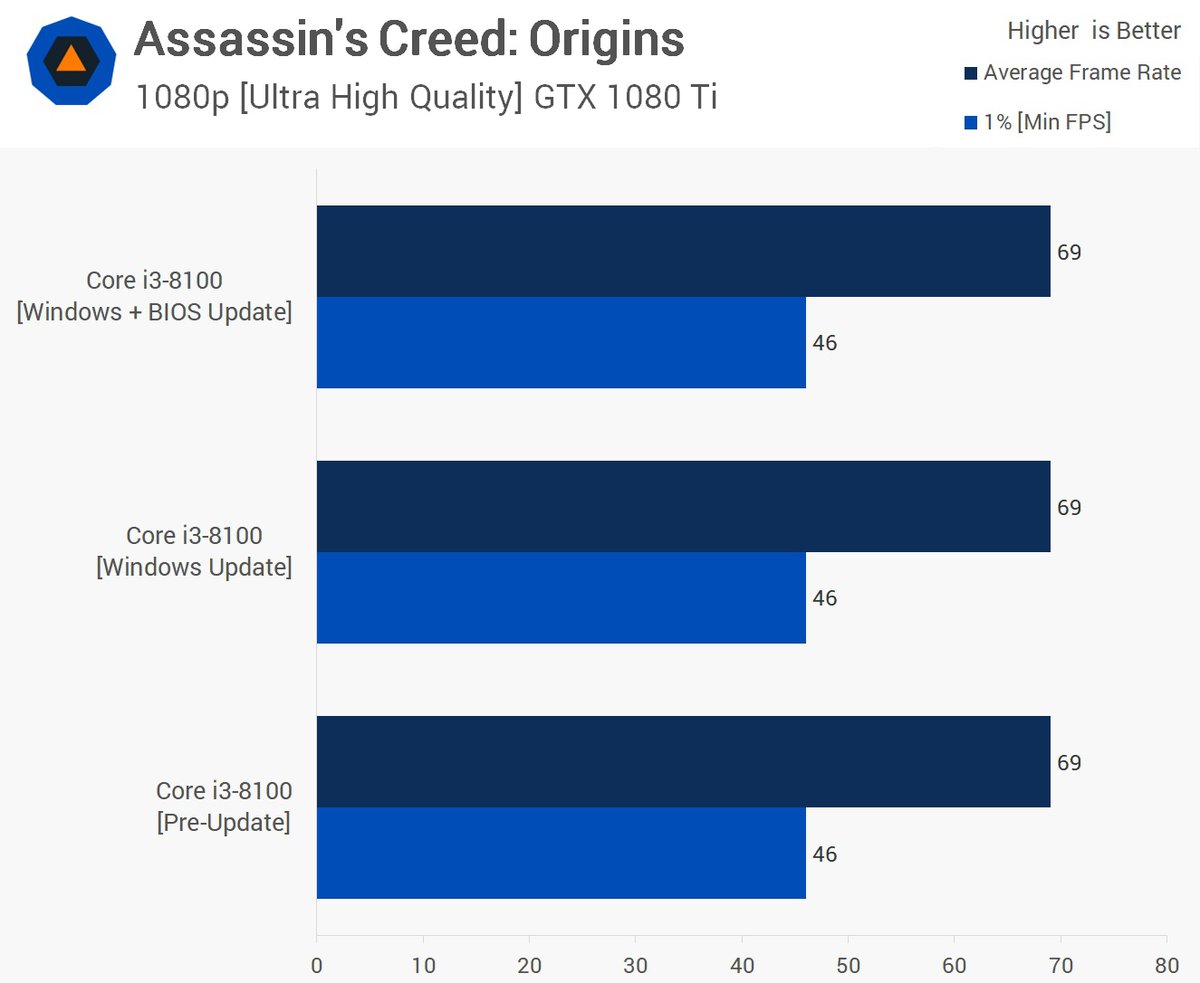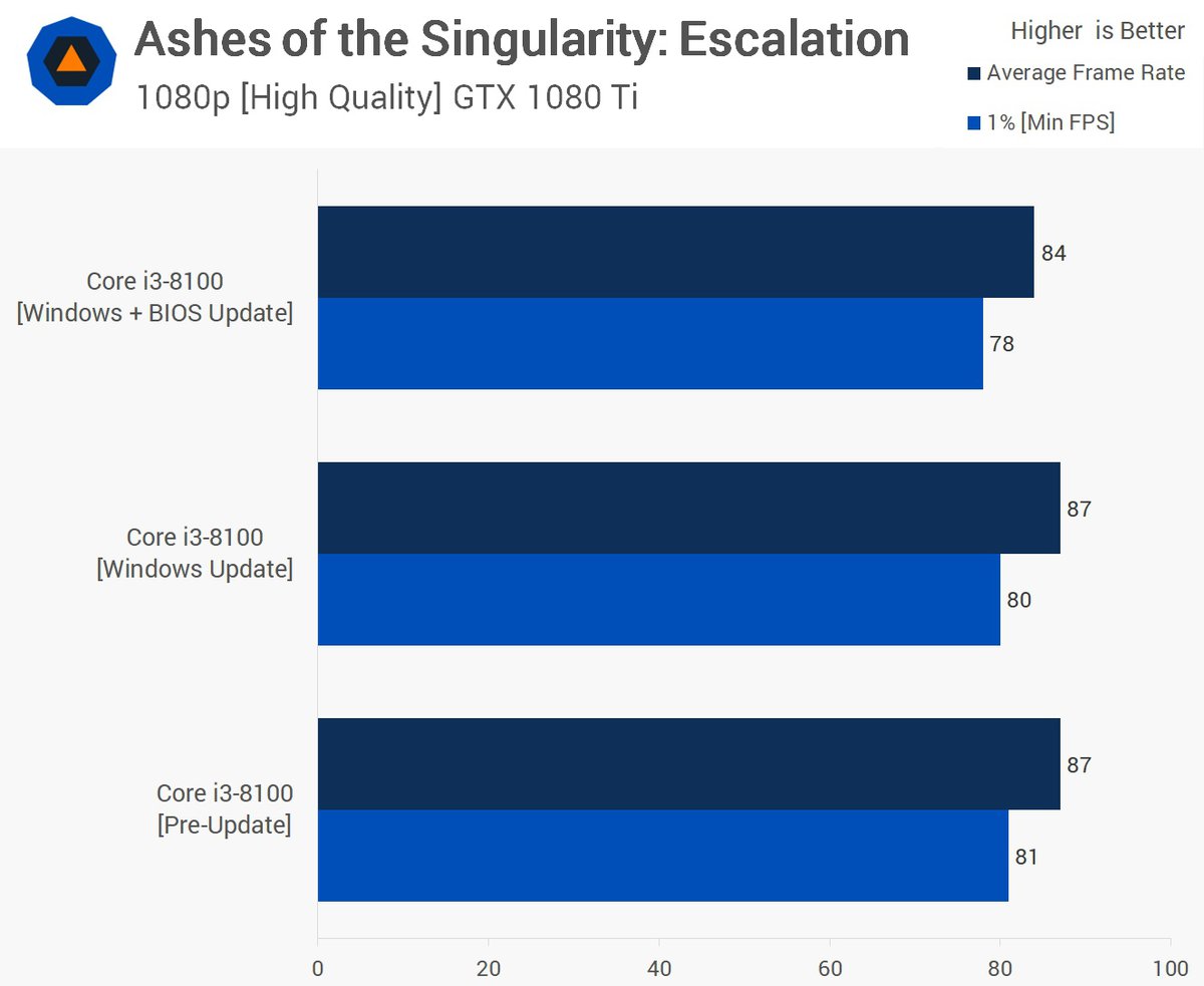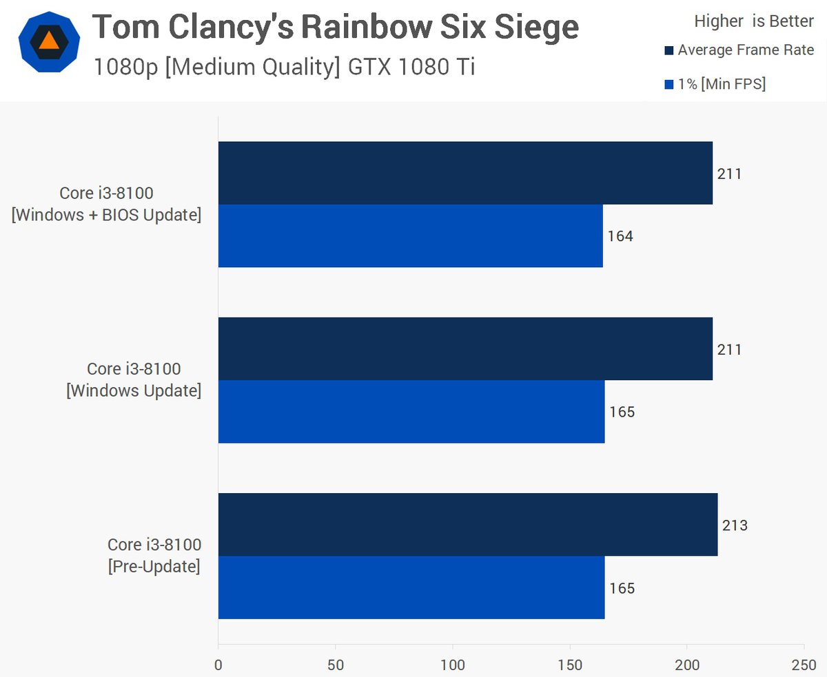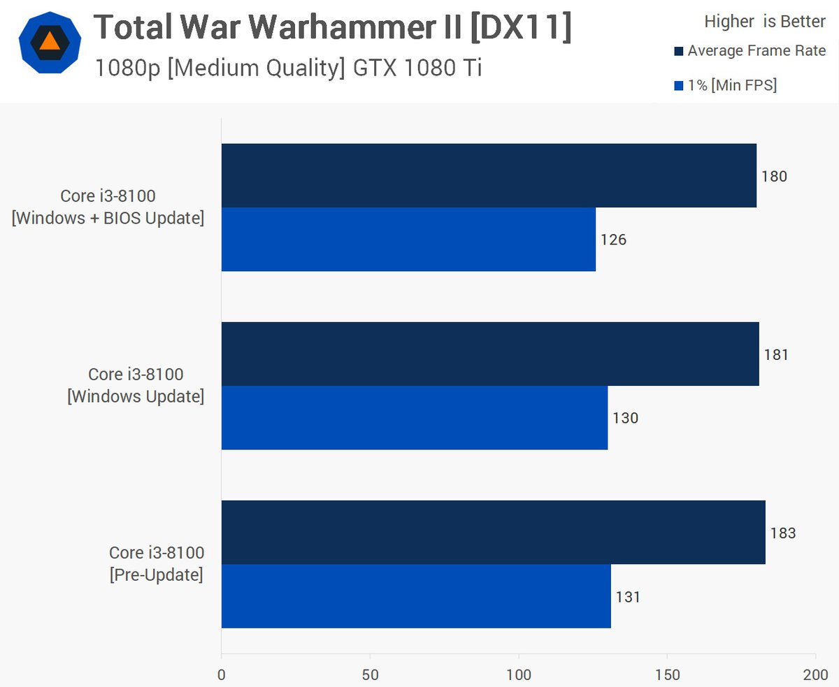 Журналисты взяли операционную систему Windows 10, не самый мощный процессор Intel Core i3-8100, снабдили его видеокартой Nvidia GeForce GTX 1080 Ti и сравнили производительность получившейся конфигурации в трех сценариях: без обновлений; с обновлением для Windows; с новой версией BIOS плюс обновление для Windows.