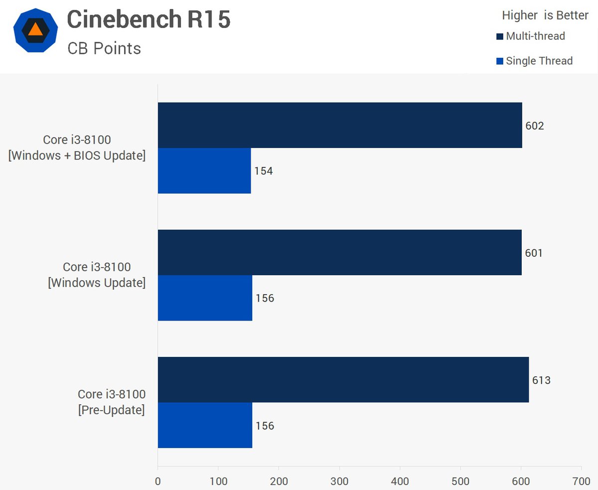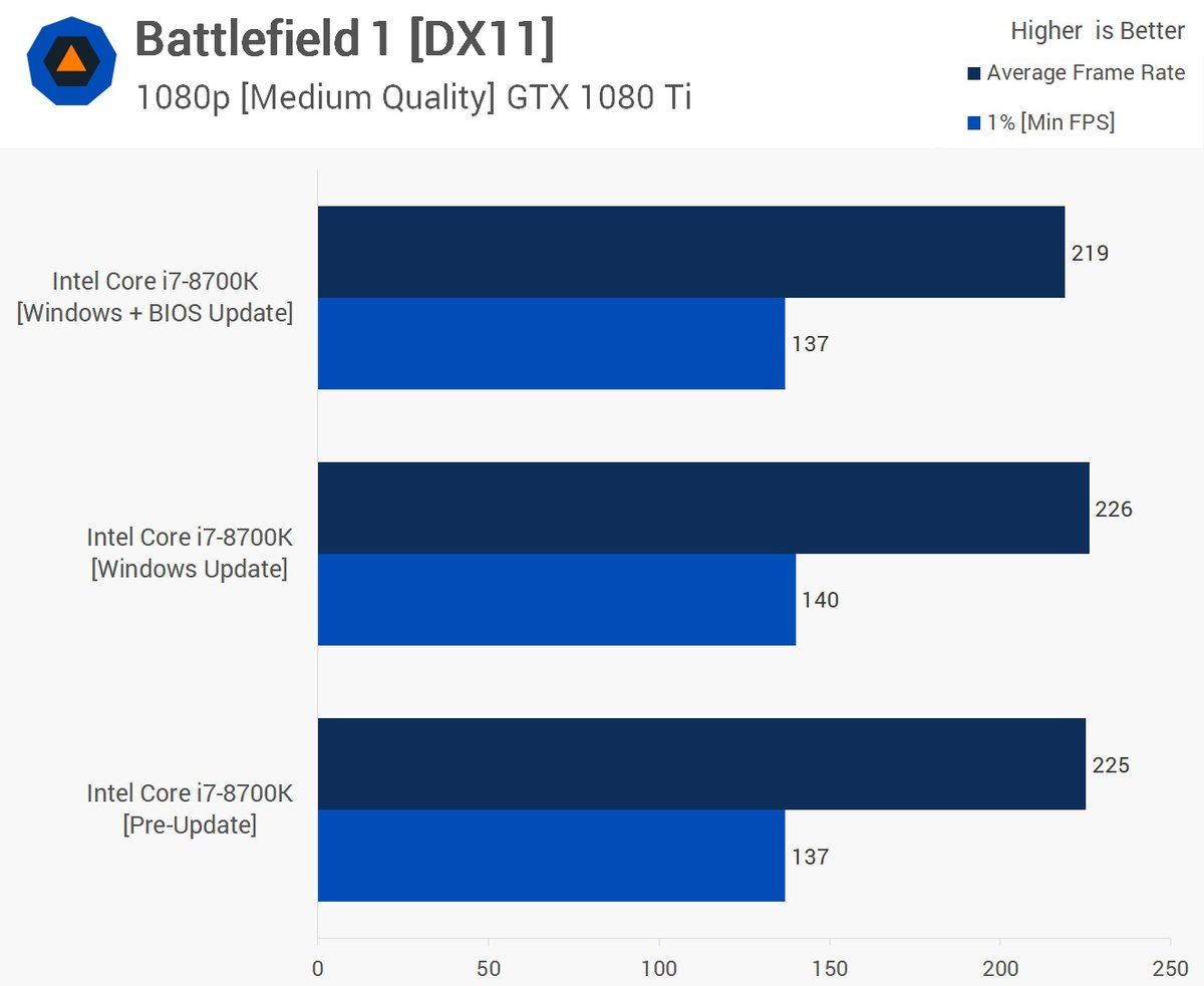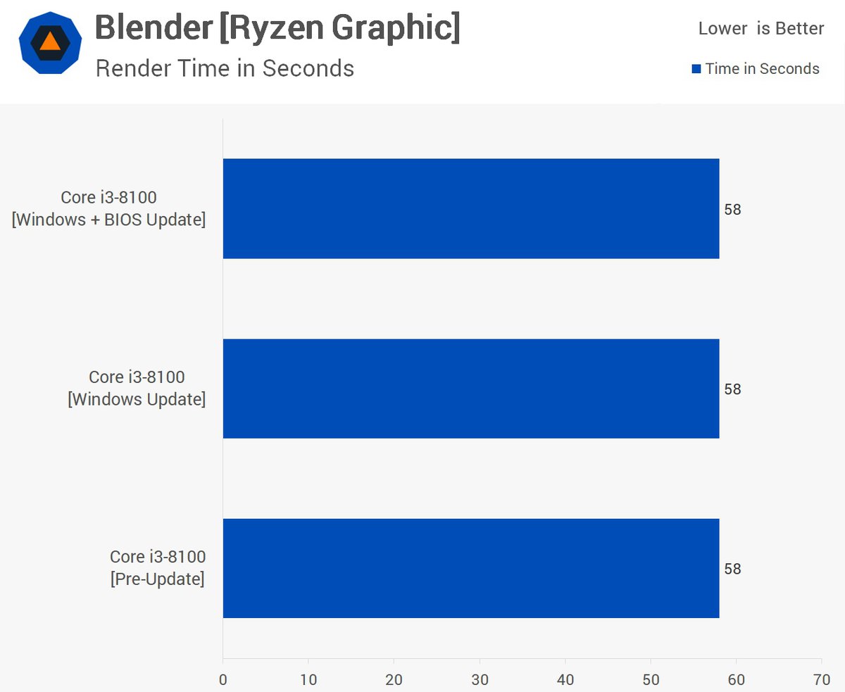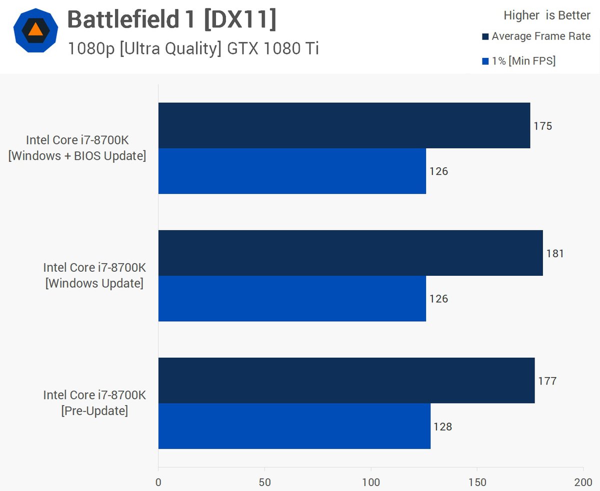 Журналисты взяли операционную систему Windows 10, не самый мощный процессор Intel Core i3-8100, снабдили его видеокартой Nvidia GeForce GTX 1080 Ti и сравнили производительность получившейся конфигурации в трех сценариях: без обновлений; с обновлением для Windows; с новой версией BIOS плюс обновление для Windows.