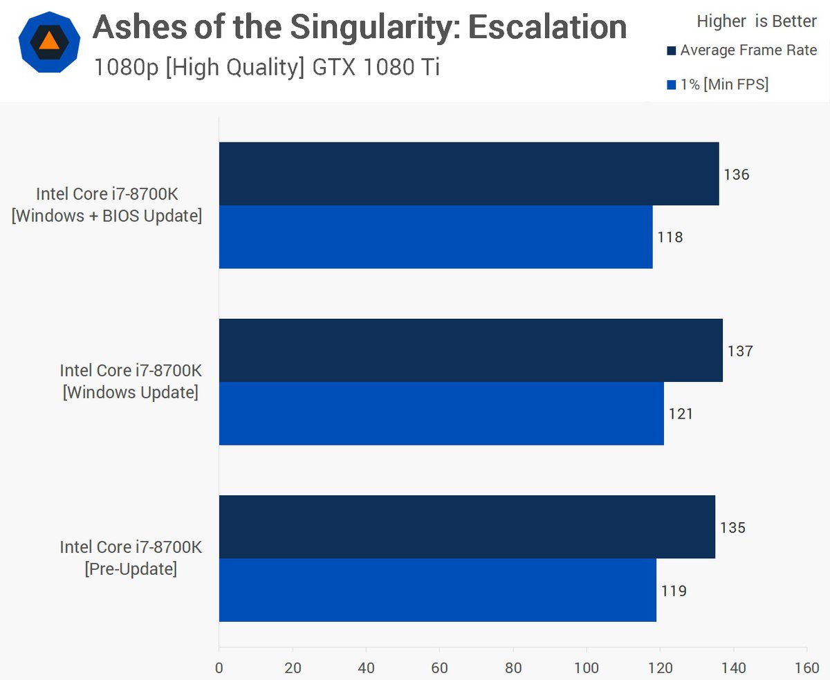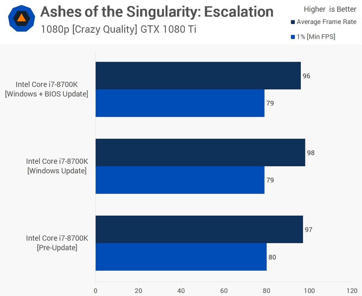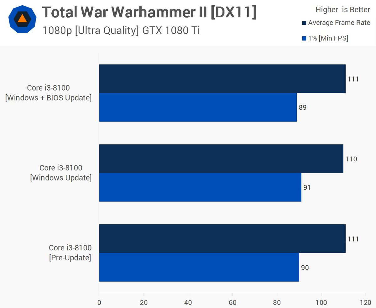 Правда, о 20-30% просадке частоты кадров речи не идет даже близко. В самом худшем случае частота кадров у полностью пропатченных систем уменьшалась на 3-4%: такие просадки были замечены в Battlefield 1, Ashes of the Singularity и Total War Warhammer 2.