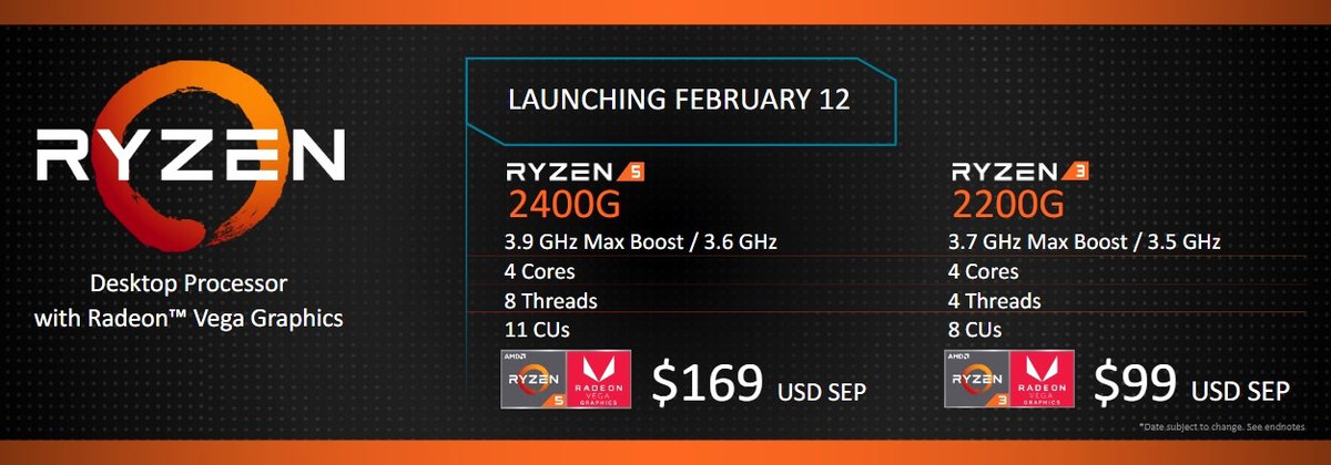 Компания также представила два процессора Ryzen со встроенной графикой Vega. Продажи чипов AMD Ryzen 2400G и 2200G стартуют 12 февраля 2018 года. Кроме того, во второй половине 2018 года AMD планирует выпустить на рынок второе поколение производительных процессоров Threadripper.