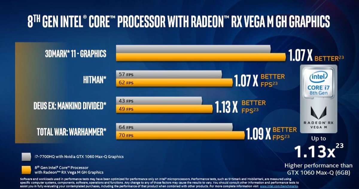 Кроме того, AMD совместно с Intel представили процессоры восьмого поколения Kaby Lake G, в которых используются графические чипы AMD Radeon RX Vega M. Каждый такой чип снабжен 4 ГБ встроенной памяти HBM2, по производительности новое решение Intel и AMD близко к видеокартам Nvidia GeForce GTX 1050 и GTX 1060.