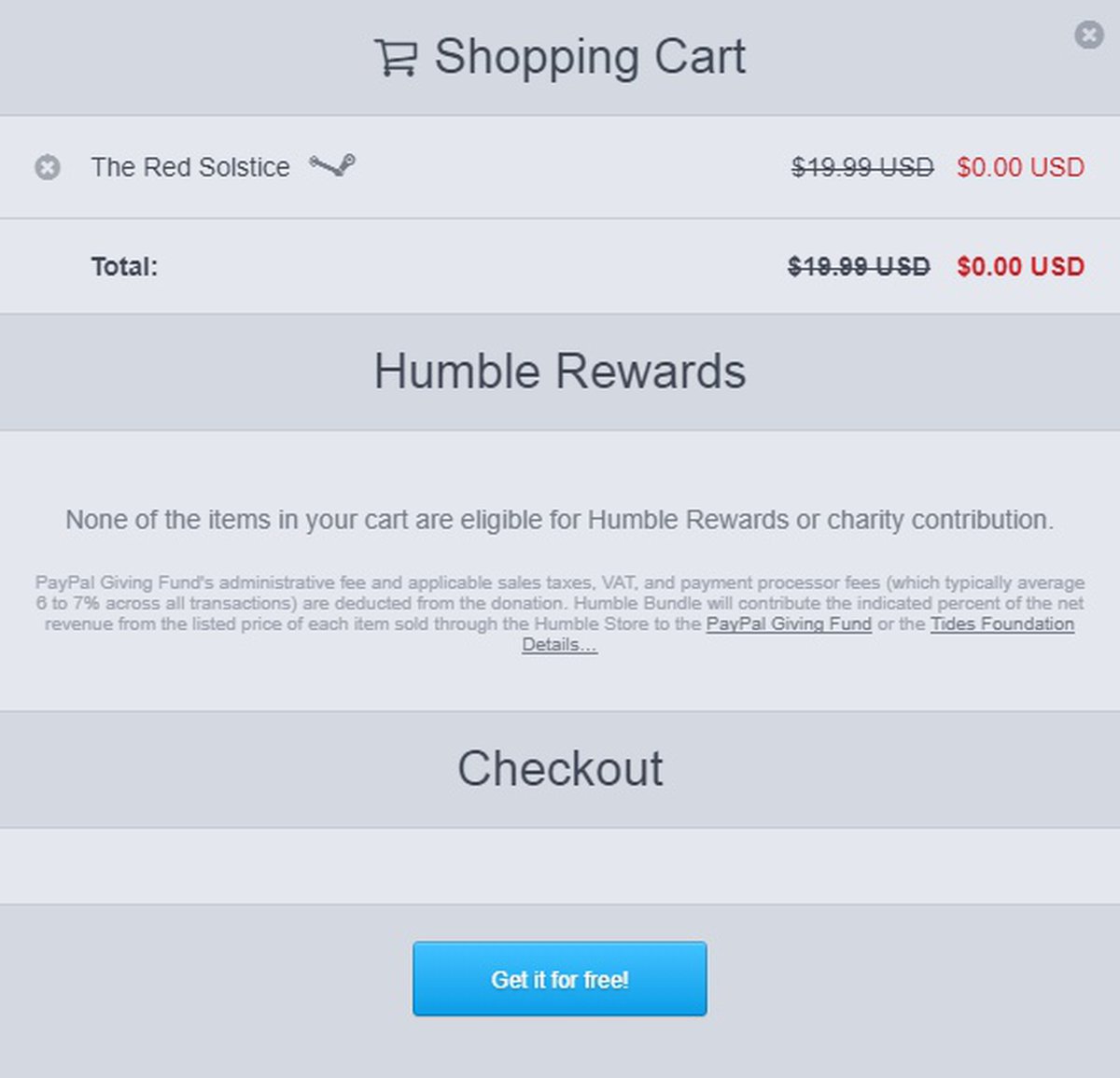 Для получения кода активации The Red Solstice в Steam вам нужно пройти несколько шагов. Сперва откройте страницу игры в Humble Bundle (не забудьте войти в свой аккаунт), добавьте ее в корзину, перейдите внутрь и жмите на кнопку "Get it for free". Никакие поля заполнять не нужно.