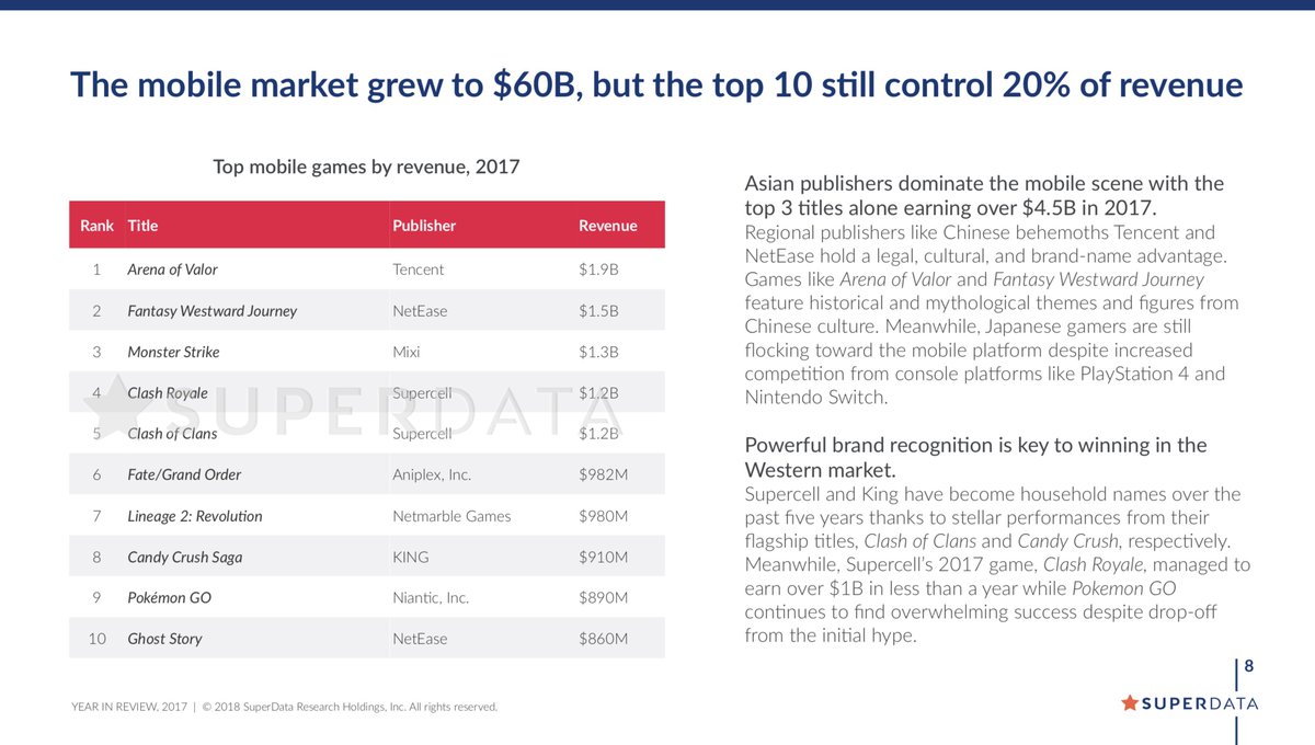 Особенно большой рост показали мобильные игры. По сравнению с 2016 годом выручка мобильных проектов выросла на $14 миллиардов, самые прибыльные игры принадлежат китайским компаниям Tencent и NetEase: за год их Arena of Valor и Fantasy Westward Journey заработали $1.9 и $1.5 миллиардов соответственно.