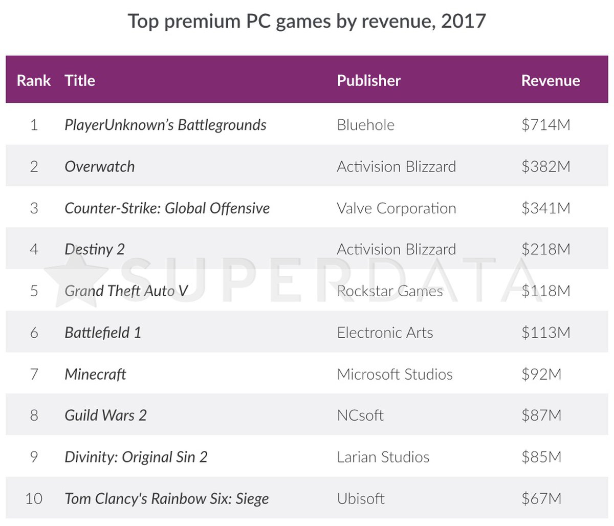 SuperData: сколько в 2017 году заработали PC-версии PUBG, Overwatch, Battlefield 1 и Destiny 2