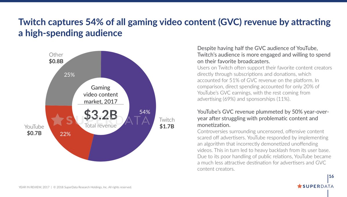 Самым популярным игровым видеосервисом 2017 года стал Twitch: на него приходится 54% всего игрового контента и выручка в размере $1.7 миллиардов. У YouTube - второе место, 22% игрового контента и $700 миллионов выручки. Годом ранее показатели YouTube были выше на 50%.