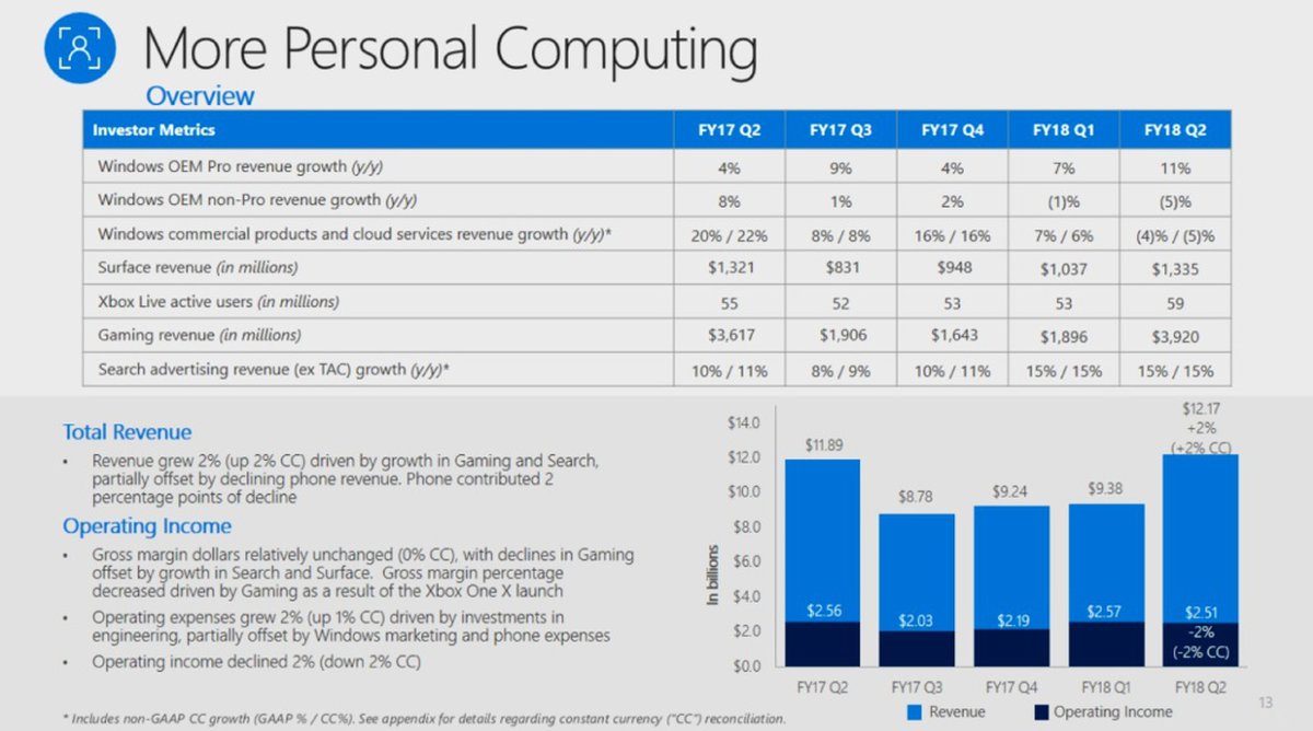 Корпорация Microsoft отчиталась за второй квартал 2018 финансового года, закончившийся 31 декабря 2017 календарного года. Квартал выдался удачный: выручка Microsoft выросла на 12% и достигла $28.9 миллиардов.