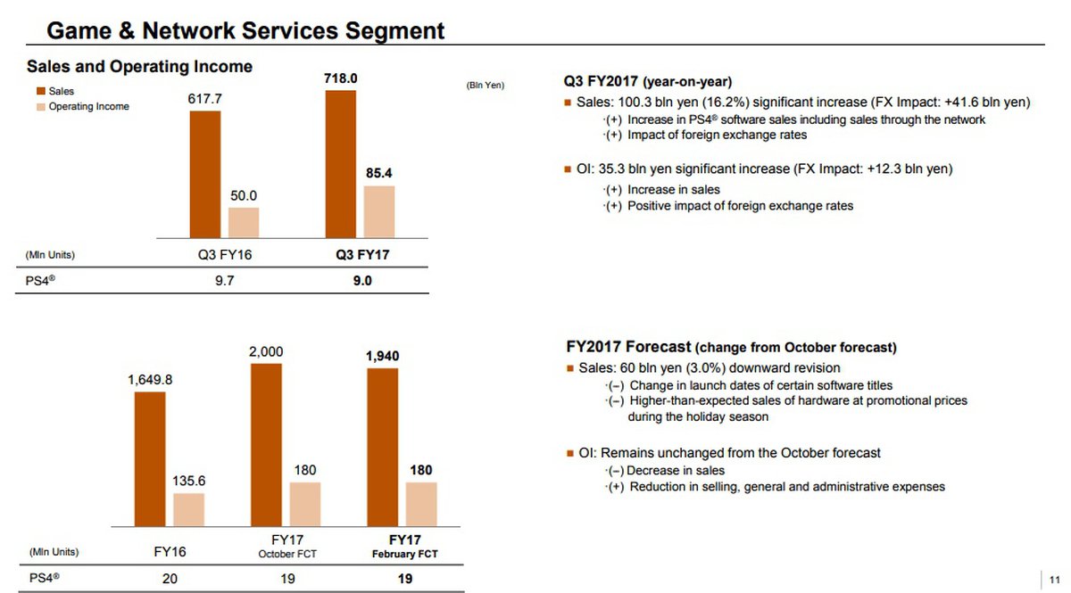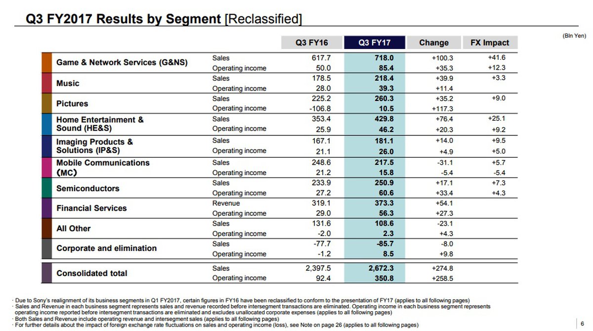 За первые 9 месяцев 2017 финансового года Sony заработала $6.3 миллиарда, общие продажи компании за этот период приблизились к $59 миллиардам. За весь финансовый год Sony планирует показать продажи на уровне $77.5 миллиардов и операционную прибыль около $6.5 миллиардов.