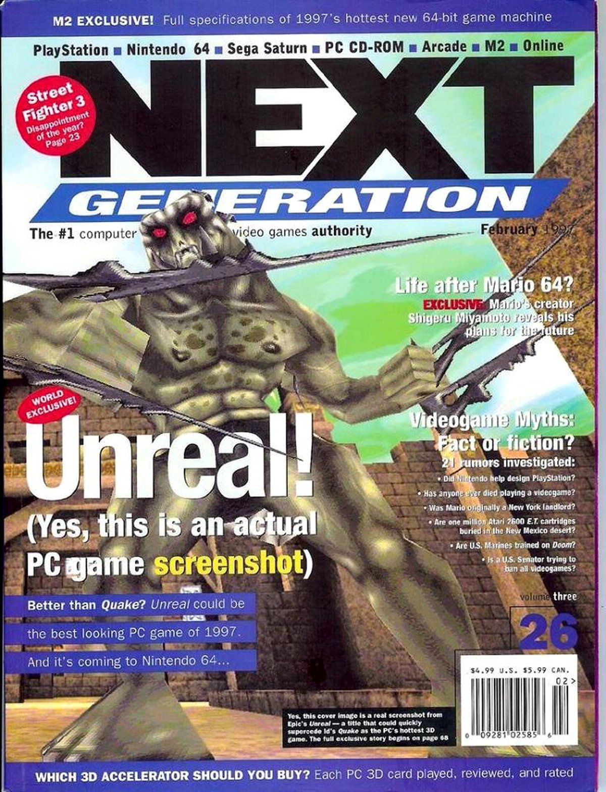 Все-таки за последние 20 лет уровень игровой графики драматически вырос. Только посмотрите, какой симпатяга из Unreal красовался на обложке февральского номера Next Generation в 1997 году.