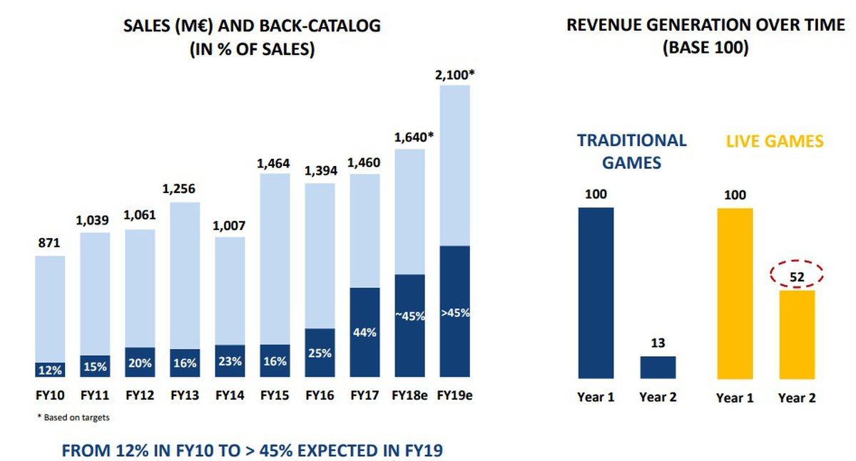 По оценке Ubisoft спустя год после выхода игра с сервисными элементами зарабатывает до половины выручки, полученной в первый год. По сравнению с обычным проектом на второй год игра как сервис зарабатывает в четыре раза больше.