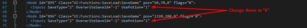 В архиве вам нужен файл MM_SaveGame.xml — он лежит в разделе Libs\UI\UIActions. Перейдите на 67 строчку и измените значение UsePotion с "1" на "0" так, как показано на скриншоте. То же самое сделайте на 70 строчке с тем же параметром.