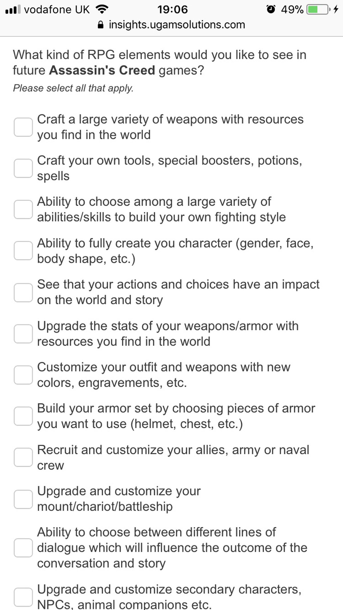 Разработчики Assassin's Creed снова проводят опрос среди фанатов серии. Среди прочих вопросов игрокам предлагается рассказать, какие элементы ролевых игр им хочется увидеть в следующих частях Assassin's Creed.