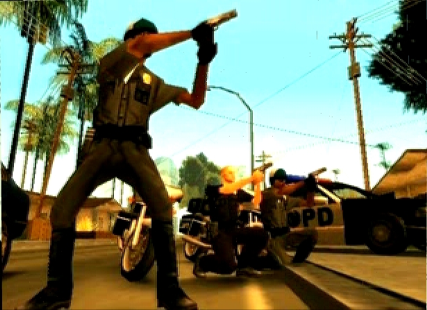Изначально, форма полицейских и их лица были другими. Раннюю форму можно заметить как на ранних скриншотах игры, так и в одной из миссий. Миссия в мотеле Джефферсон, когда полицейского на капоте машины распиливают лопасти вертолёта. Во время распила, когда коп уже готов к употреблению в салат Цезарь, текстура кусков меняется на ту, что на ранних скриншотах игры.