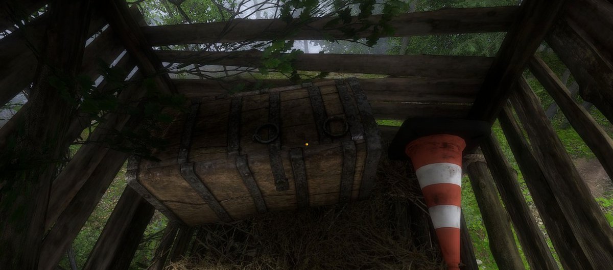 На недоступной площадке стоит сундук (ничего интересного) и лежит дорожный конус, каким-то образом переместившийся в средневековую Богемию из нашего времени. Забрать его с собой не выйдет: сувенир закреплен намертво.