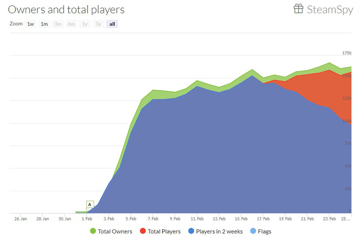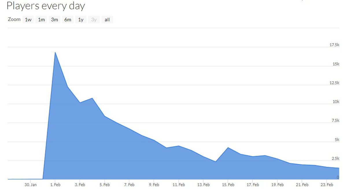 В первый день релиза, 1 февраля, в Battalion 1944 одновременно сражался 16771 игрок. Вчера, 24 февраля, пиковый онлайн Battalion 1944 не превышал 1481 игрока — чуть больше 8% от стартовой аудитории проекта.