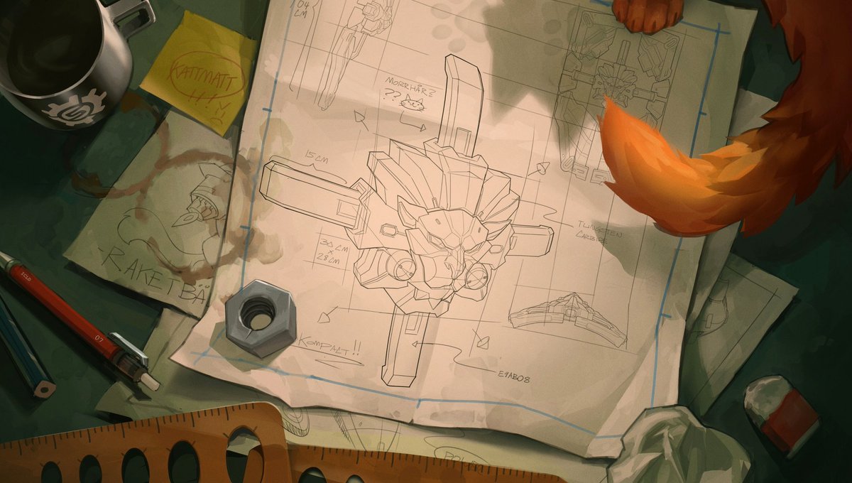 На картинке есть еще одна интересная деталь — вернее, даже несколько. В правом верхнем углу изображения виднеется рыжая лапа и рыжий хвост, прямо на чертеж отбрасывают тень чьи-то заостренные уши. Левее чертежа виднеется фрагмент рисунка реактивного ранца для существа с шикарным хвостом.