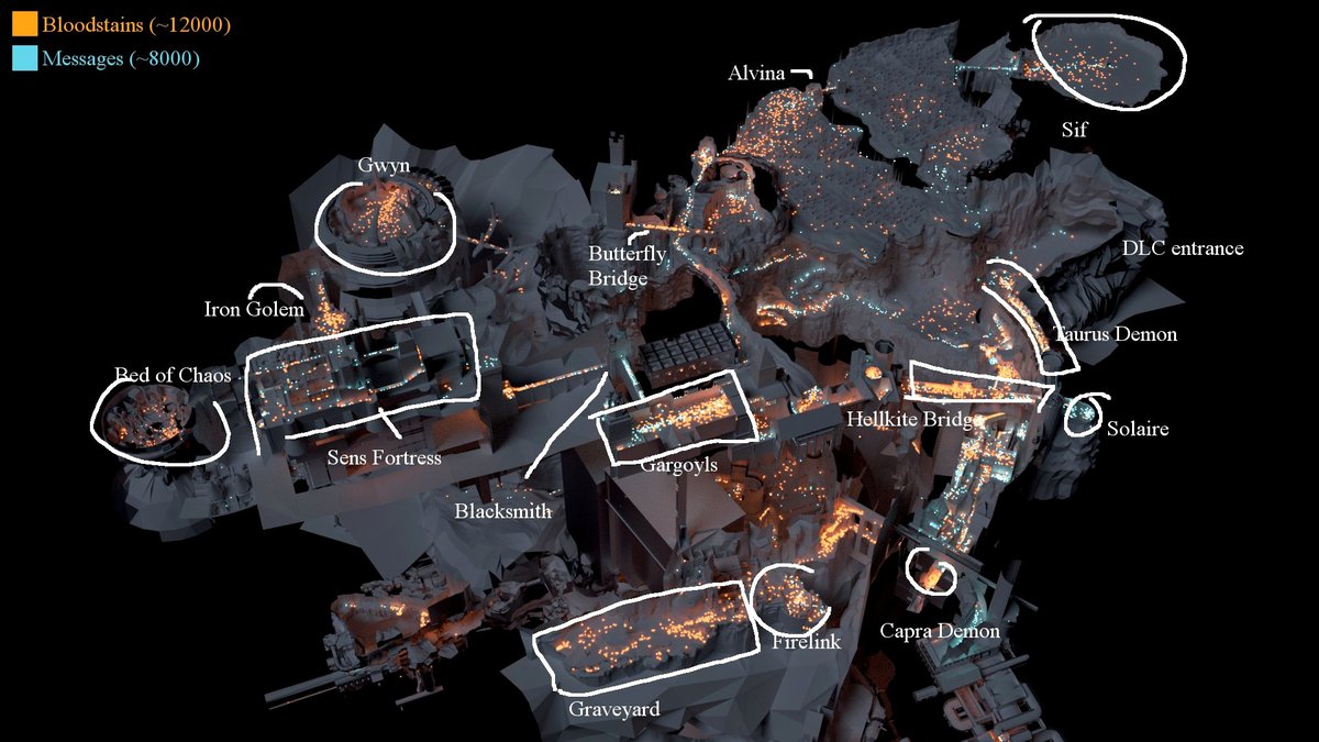 Один из фанатов Dark Souls решил выяснить, где именно игроки погибали чаще всего. Для этого DriftItem — такой замысловатый у него ник — создал своеобразную "тепловую карту", проанализировав 20 тысяч меток, оставленных игроками.