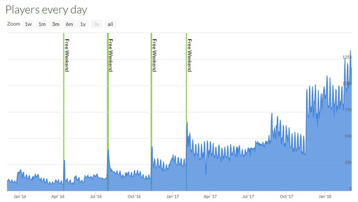 В августе-октябре 2017 года активность игроков плавно снижалась, однако с ноября, после выхода обновления White Noise, ситуация изменилась. Уже в январе пиковый онлайн в Rainbow Six Siege не опускался ниже 80 тысяч игроков, в феврале он достиг 120 тысяч, а сейчас, в марте, подбирается к 180 тысячам — это втрое больше ноябрьских показателей.