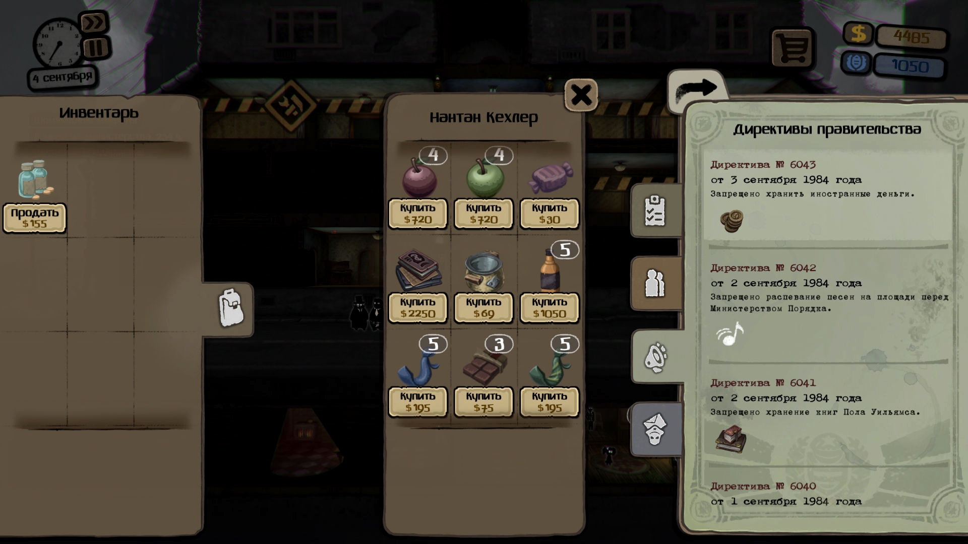 Воруй, подставляй, доноси или не делай этого. Игра всегда старается тебе подкинуть непростой моральный выбор и донести простейшую суть — или ты или тебя. Каждый день выходят новые директивы, которые так и манят сдать жильца, чтоб впоследствии продать его вещи.