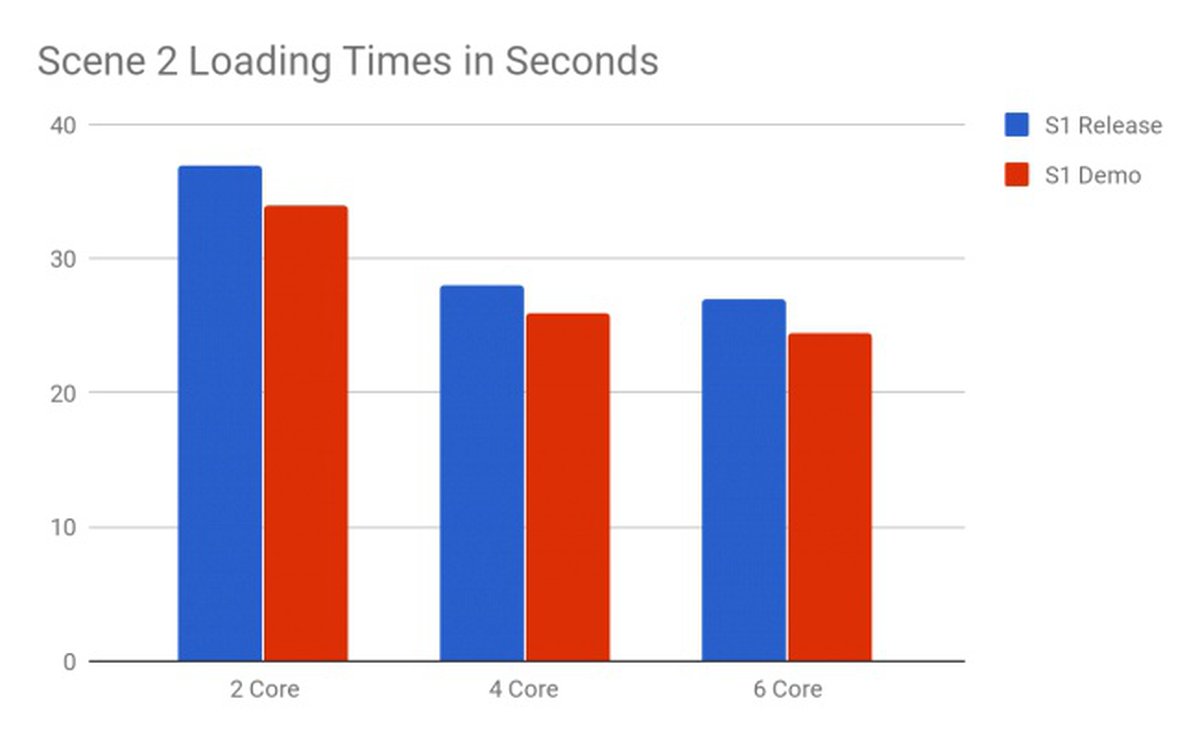 Однако есть момент, который может объясняться именно влиянием системы Denuvo. Редактор издания протестировал скорость загрузки игры и обнаружил, что во всех трех тестовых сценах демо-версия грузилась чуть быстрее вне зависимости от количества доступных ядер. Прирост скорости загрузки по сравнению с финальной версией составил примерно 6.7%.