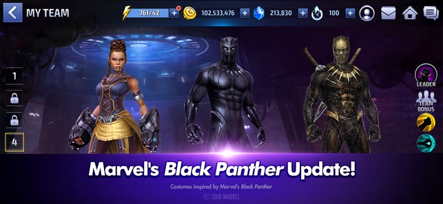 Особенность игры в том, что с каждым выходом фильма, разработчики готовят главных персонажей к выпуску в самой игре. Вышла кинокартина Чёрная Пантера, в этот же момент в игру добавили нескольких персонажей из фильма.