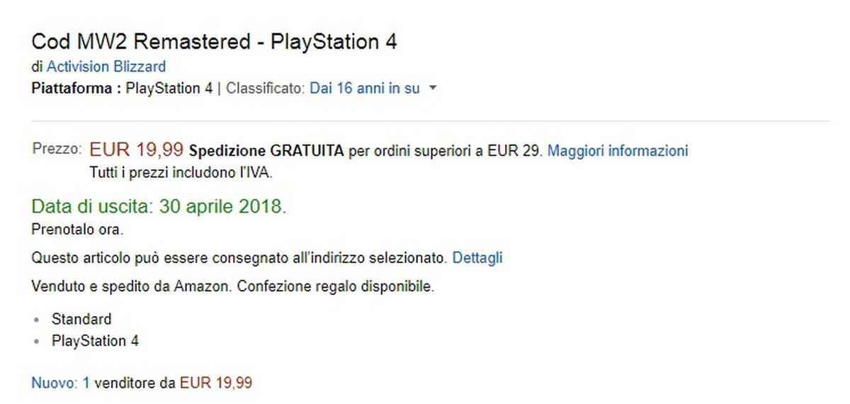 Редакторы итальянского подразделения IGN заметили на сайте местной версии интернет-магазина Amazon две версии ремастера Call of Duty Modern Warfare 2: для PlayStation 4 и Xbox One. На страницах обеих игр есть дата выхода (30 апреля, маловероятно) и цена — 19.99 евро, около 25 долларов. Похоже на правду.