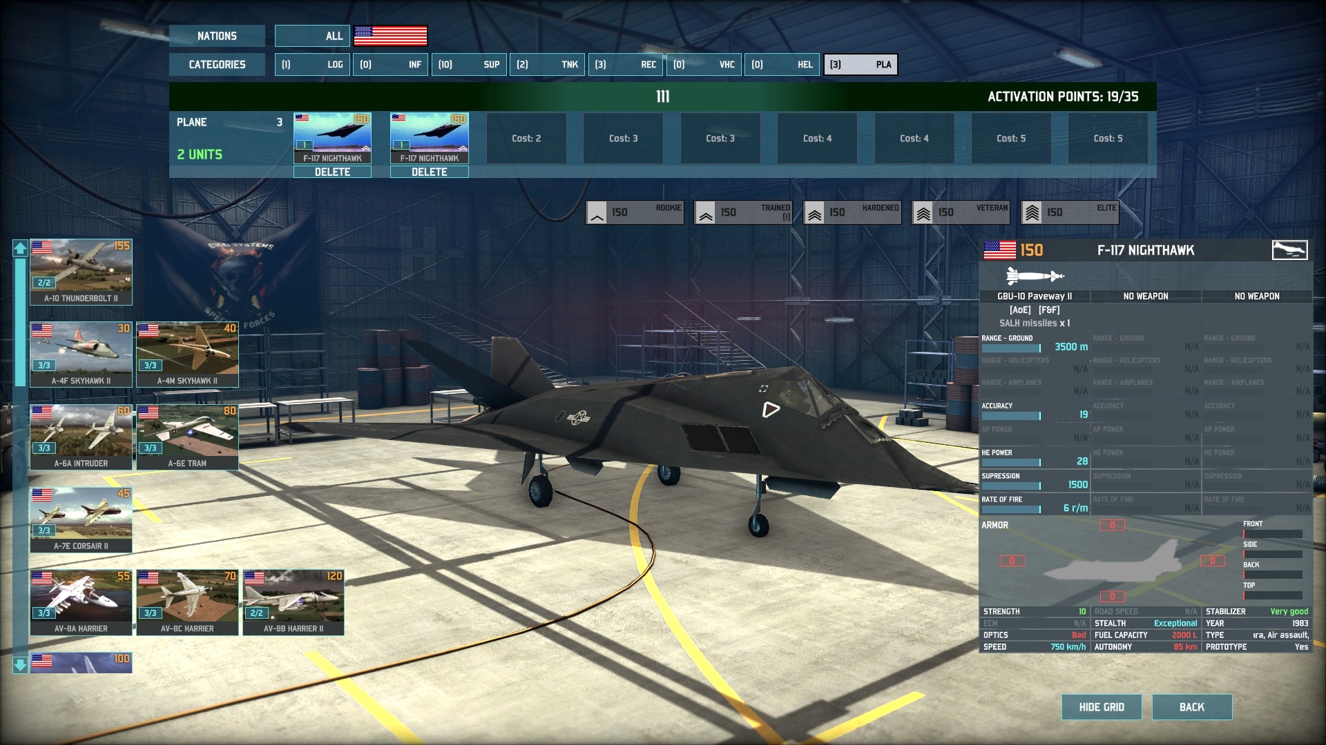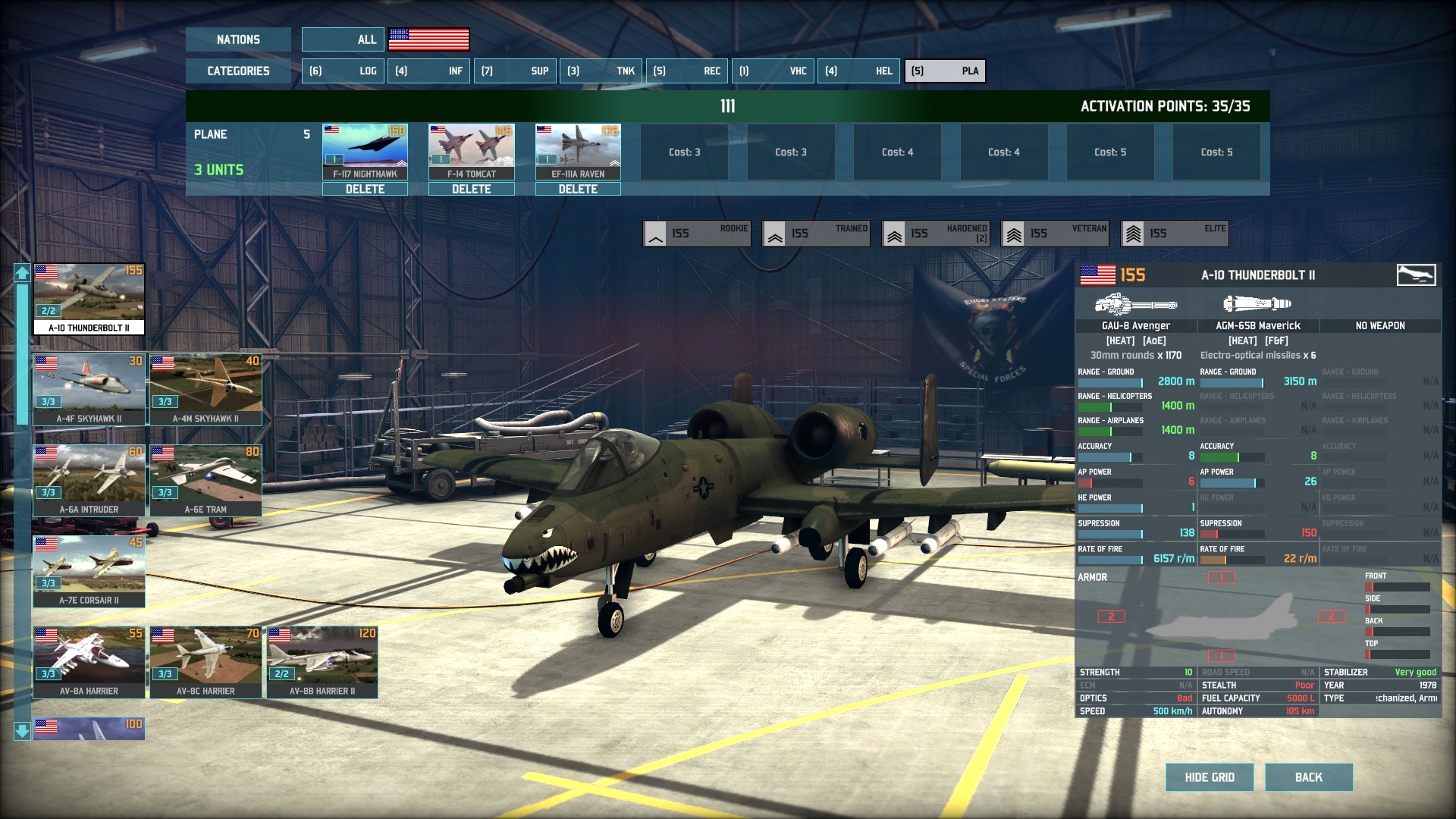 Изначально, при создании своей армии вы должны определиться со стороной конфликта и с тем, армию какой нации вы хотите видеть под своим руководством. Можно, конечно, просто взять и собрать колоду из всех стран сразу, однако при выборе нации вам дают небольшие плюшки и бонусы (в частности, можно взять больше разных юнитов под свой контроль). Также можно выбрать коалицию, в которой будут присутствовать войска нескольких стран сразу, и заодно сохранится часть бонусов. Кроме страны-представителя вашего альянса, вы также можете выбрать направленность и тематику своей колоды. Например, сделать упор в пехоту, авиацию, или поддержку (читай, артиллерия и зенитки). В случае тематической колоды вы, естественно, также сможете выбирать все типы войск, однако определённый тип юнитов, в зависимости от специализации, будет стоить меньше очков.