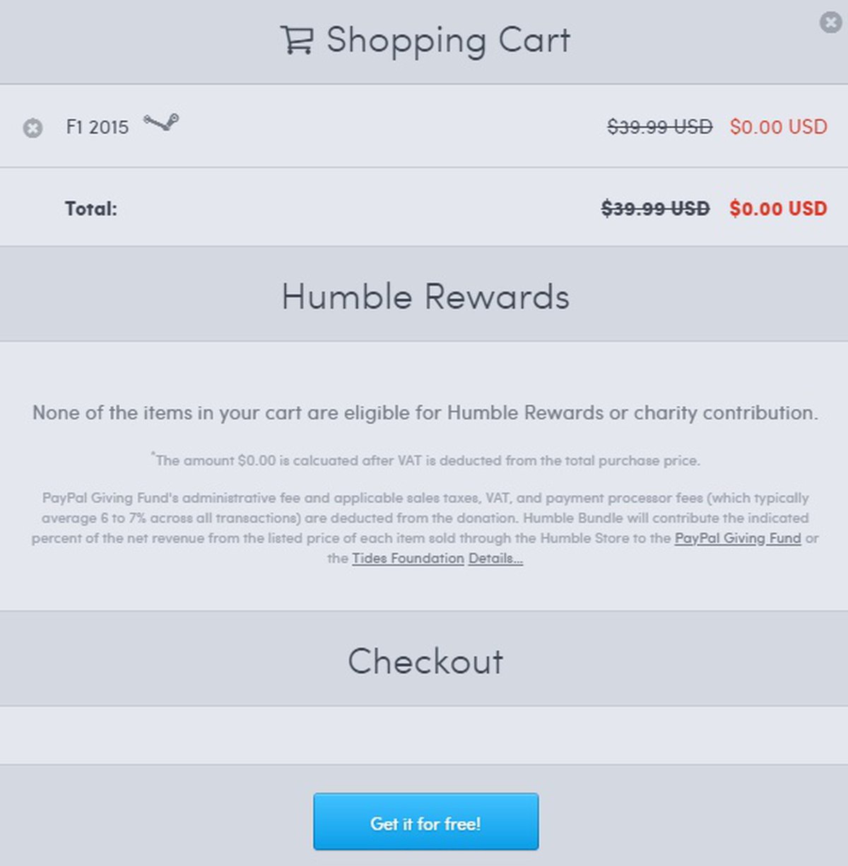 Алгоритм получения Steam-ключей за это время не изменился. Сначала вам нужно открыть страницу F1 2015 в Humble Bundle, добавить игру в корзину и перейти туда самому. Перед вами откроется примерно такое окно.