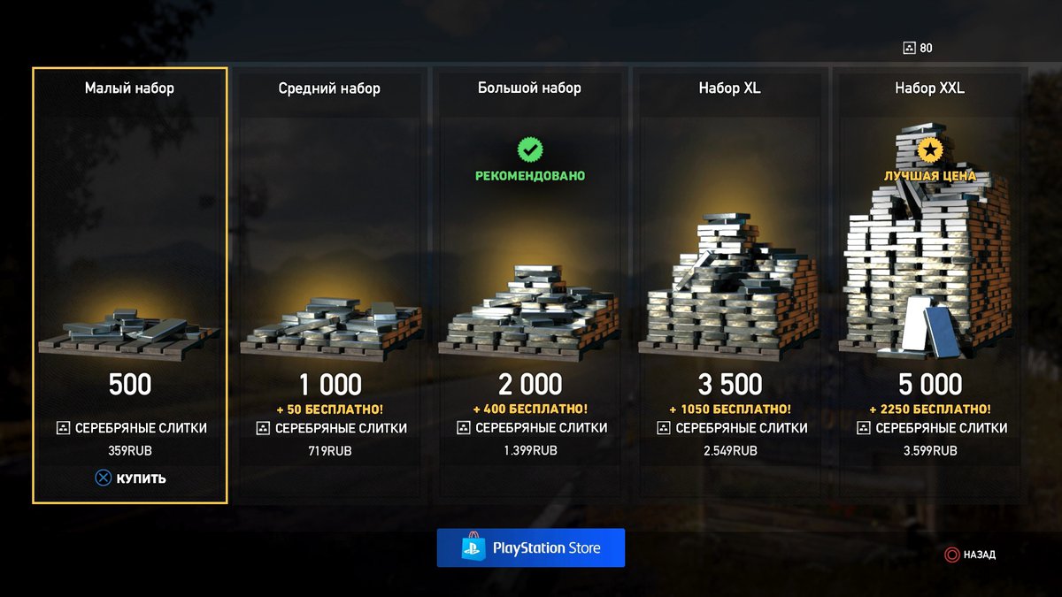 Здесь маленький набор из 500 слитков предлагается купить за 359 рублей, большой набор из 5000 слитков продается за 3599 рублей. При этом сама Far Cry 5 продается в PlayStation Store за 3999 рублей.
