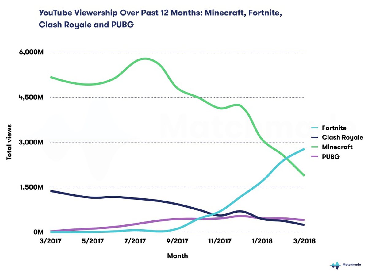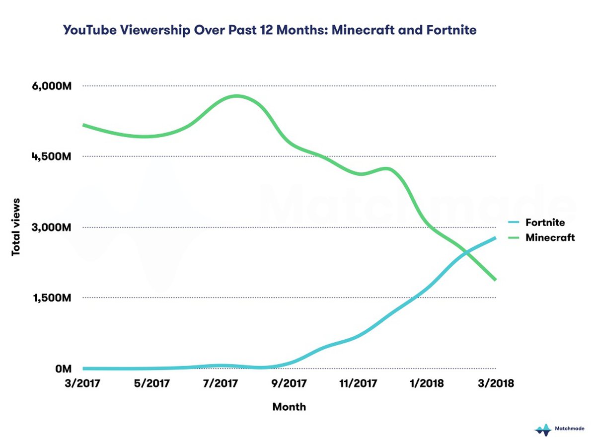 Такая оценка популярности Fortnite приводится в отчете исследовательской компании Matchmade. Игра смогла подвинуть с первого места Minecraft, доминировавший на YouTube «с начала времен»: в марте ролики по Minecraft сгенерировали чуть больше полутора миллиардов просмотров, а Fortnite смогла показать результат почти в 3 миллиарда просмотров.