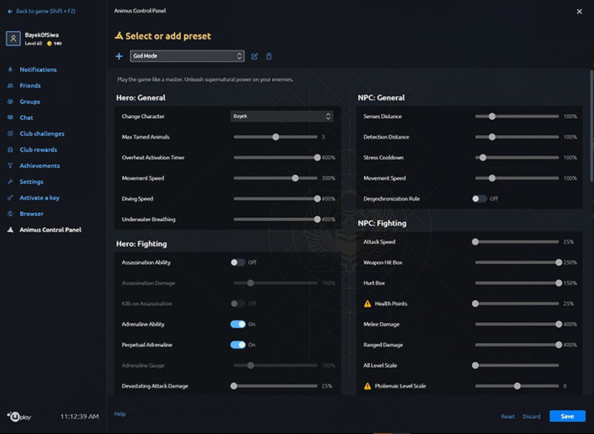 Повлиять на параметры Assassin’s Creed Origins позволит «Панель управления Анимусом»: специальное окно настроек, действующее отдельно от основной игры. Панель позволяет редактировать 75 параметров, в комплекте с ней идут три варианта заранее предустановленных настроек. Судя по скриншоту ниже, один из них называется God Mode.
