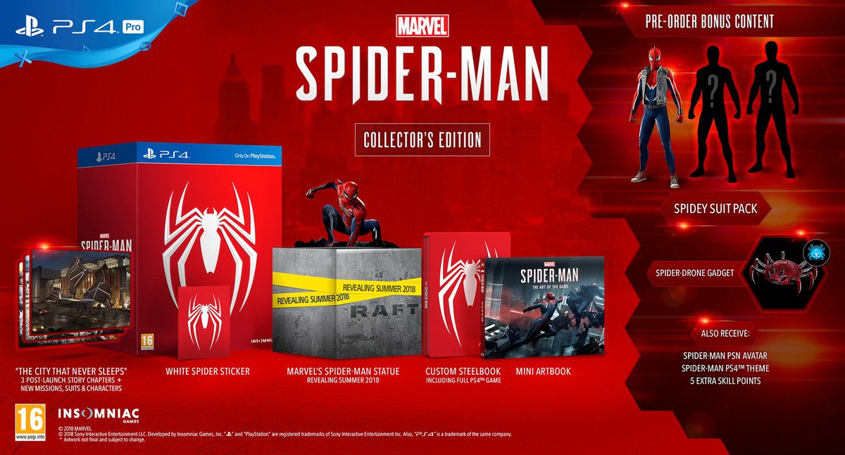Хардкорные фанаты Человека-паука смогут приобрести коллекционное издание. Сюда входит контент расширенного издания, а также стилбук, мини-артбук, стикер Человека-паука и статуэтка главного героя игры.