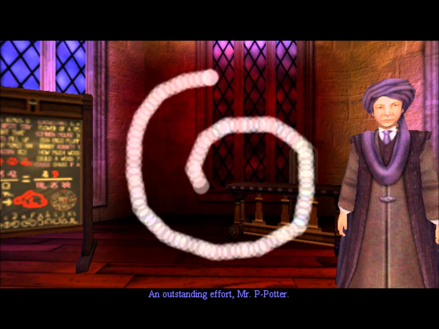 Затем идет встреча с Гермионой и первый урок по защите от Темных Искусств. Как же скрупулезно я пытался нарисовать мышкой знаменитейший Флиппендо и как часто мне не удавалось это сделать. Ей богу, даже сейчас, если я сяду проходить эту игру, я не смогу этого сделать. Особенно по той причине, что контур, который надо заполнять и контур, который для игры считается верным — разные. Пригорало от этого когда-то знатно.