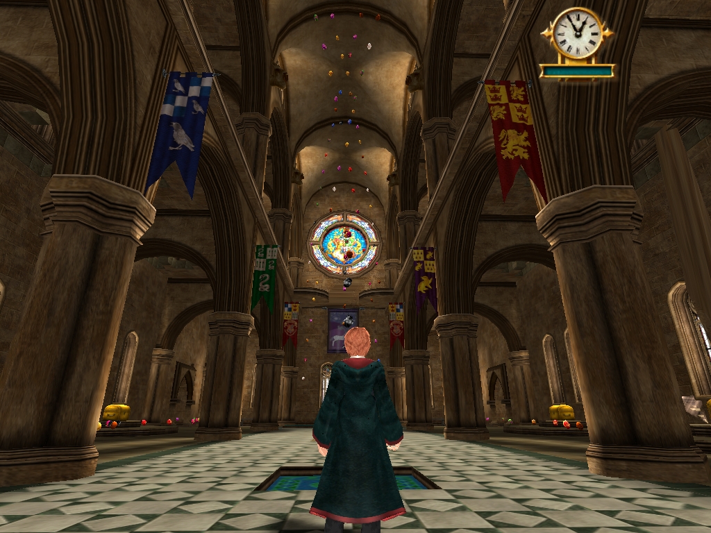 Между уроками и какими-то сюжетными событиями мы вольны побегать по некоторым участкам замка, но делать тут не особо есть что. Все снова сводится к тайникам, в которых будут бобы или карточки. Можно наткнуться на Фреда и Джорджа, которые за очередные 25 бобов дадут вам карточку. Иногда даже придется сражаться с Пивзом или тот же Малфой захочет в вас взрыво-конфеты покидать.