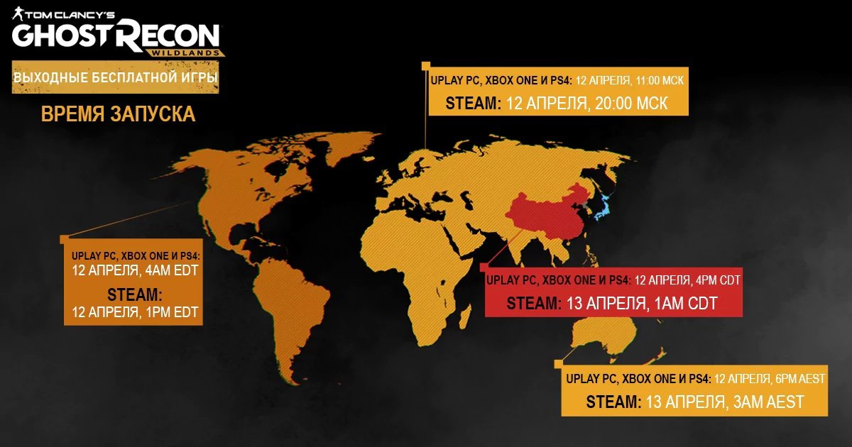 Поучаствовать в бесплатных выходных могут владельцы всех платформ: PC, PlayStation 4 и Xbox One. На PC скачать клиент Ghost Recon Wildlands можно в двух магазинах: Uplay (там бесплатные выходные уже начались) и Steam (возможность загрузки появится после 20:00 по Москве).