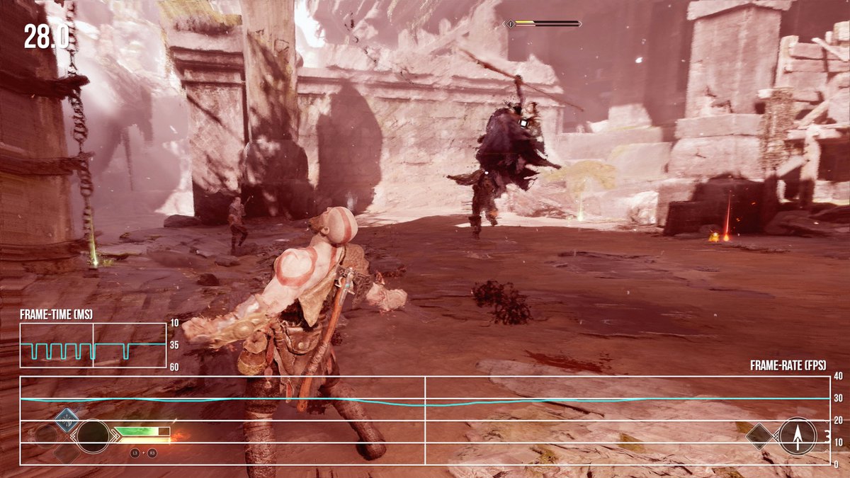 Показатели частоты кадров God of War при запуске на обычной PlayStation 4 ближе всего к Resolution Mode в версии для PlayStation 4 Pro. Большую часть времени консоль выдает стабильные 30 кадров в секунду, однако некоторые сцены — те же, что и на PS4 Pro — нагружают консоль так, что 30 fps превращаются в 29 или даже 27 кадров в секунду.