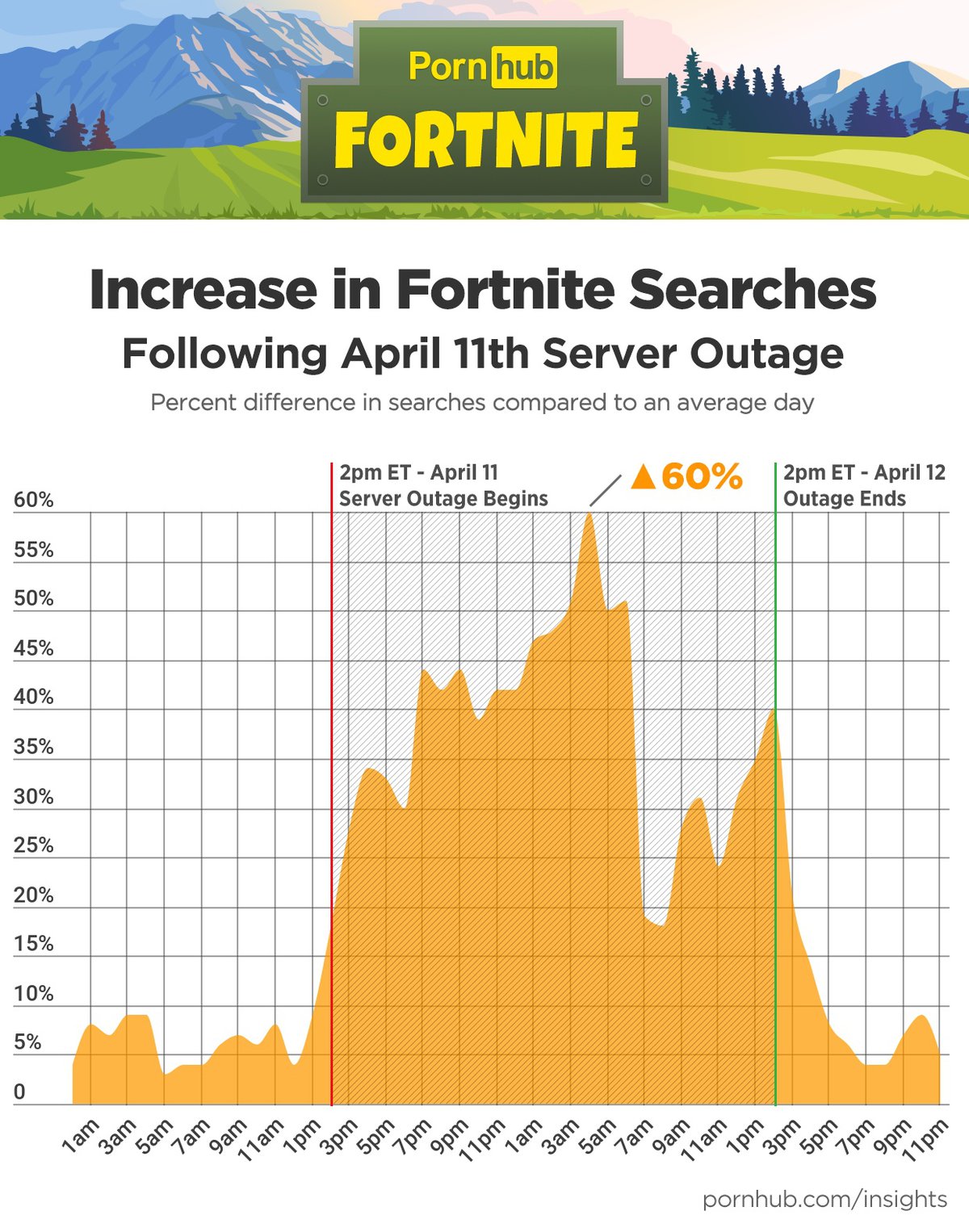 Оказалось, что вскоре после начала проблем у Fortnite в PornHub зафиксировали несколько аномалий. Во-первых, значительно увеличилось число поисковых запросов, связанных с Fortnite: в пике количество таких запросов было на 60% больше обычных показателей. Почти одновременно с запуском Fortnite ситуация нормализовалась и число запросов упало до привычных значений.