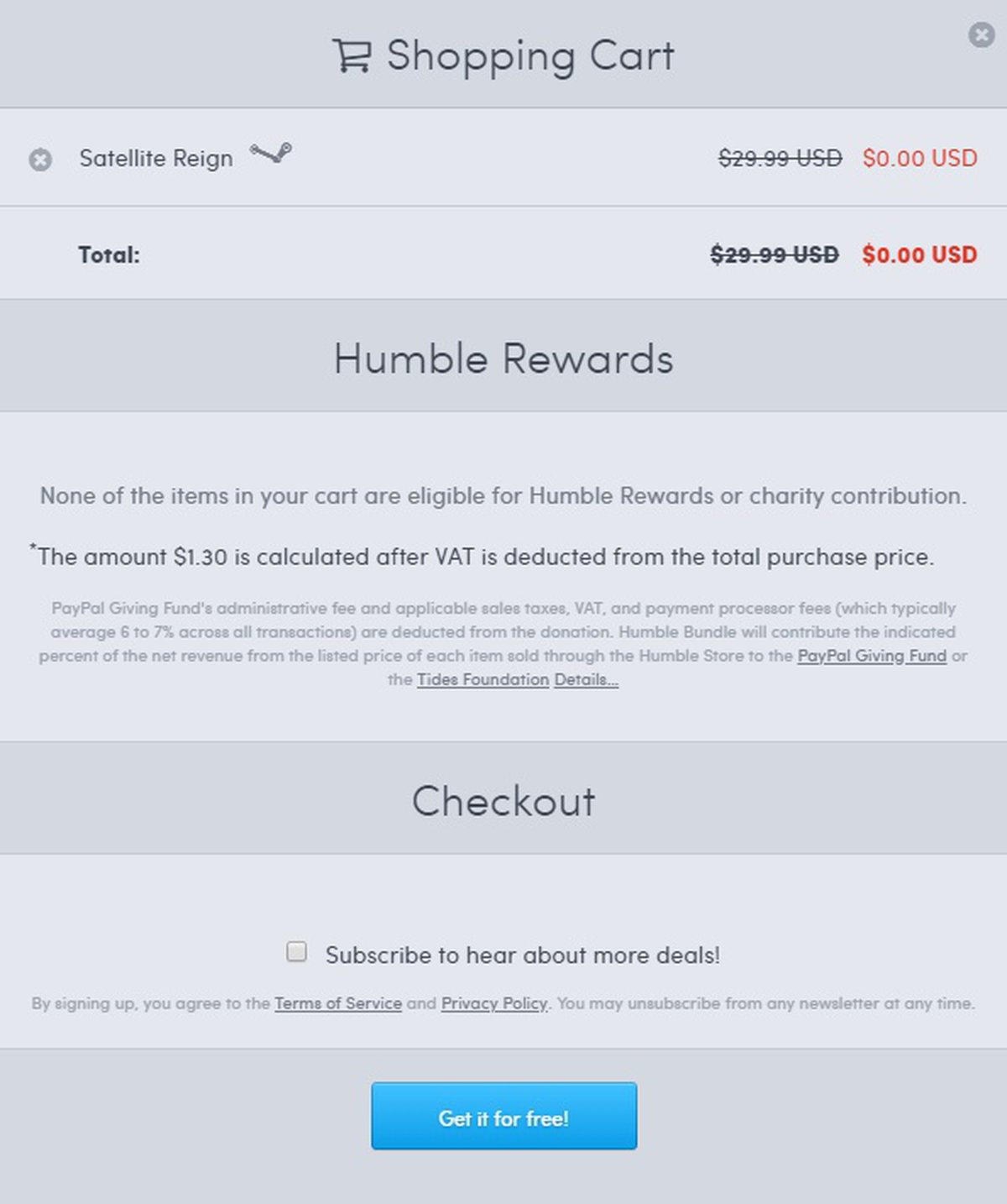 Галочку "Subscribe to hear about more deals!" в нижней части окна ставить не стоит — в противном случае вы время от времени будете получать письма от магазина. Лучше ничего не трогайте: просто кликайте по синей кнопке "Get it for free".