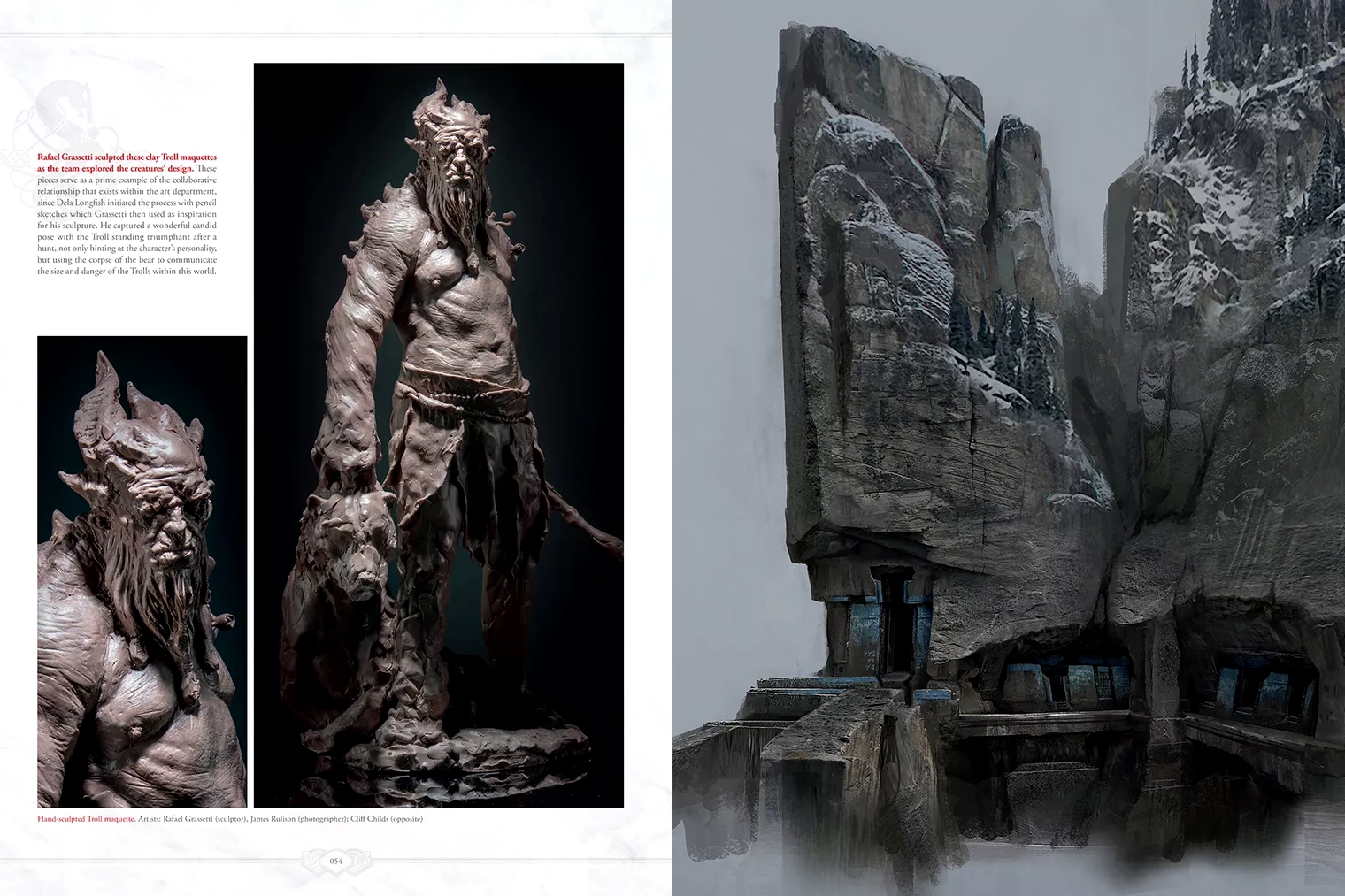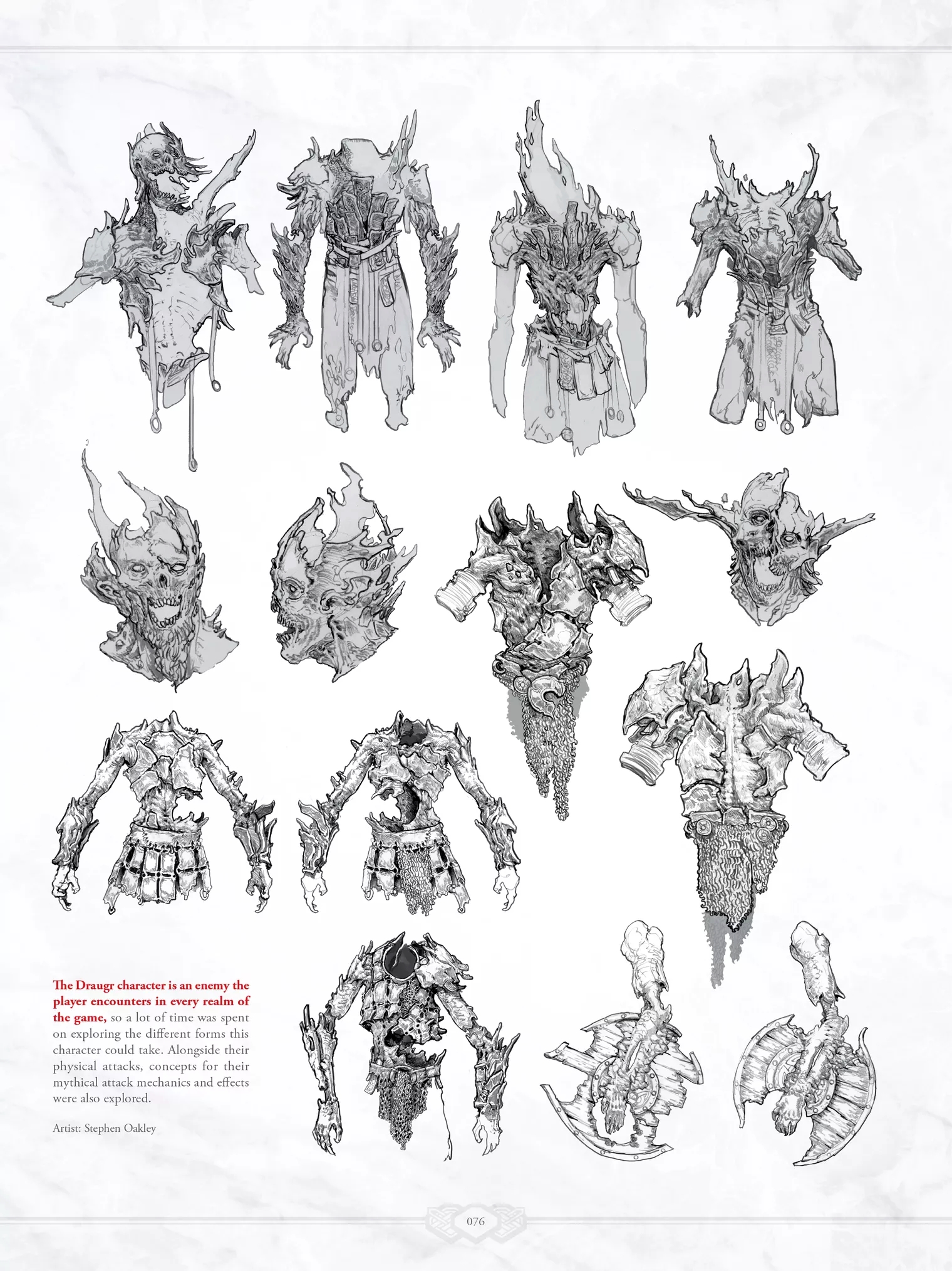 Помимо концепт-артов главного героя здесь можно увидеть чрезвычайно проработанную скульптуру тролля, созданную Рафаэлем Грассетти, и концепт-арты нескольких вариантов драугров. Похоже, в комплекте с делюкс-изданием God of War идет другой артбук — в нем этих концептов нет.