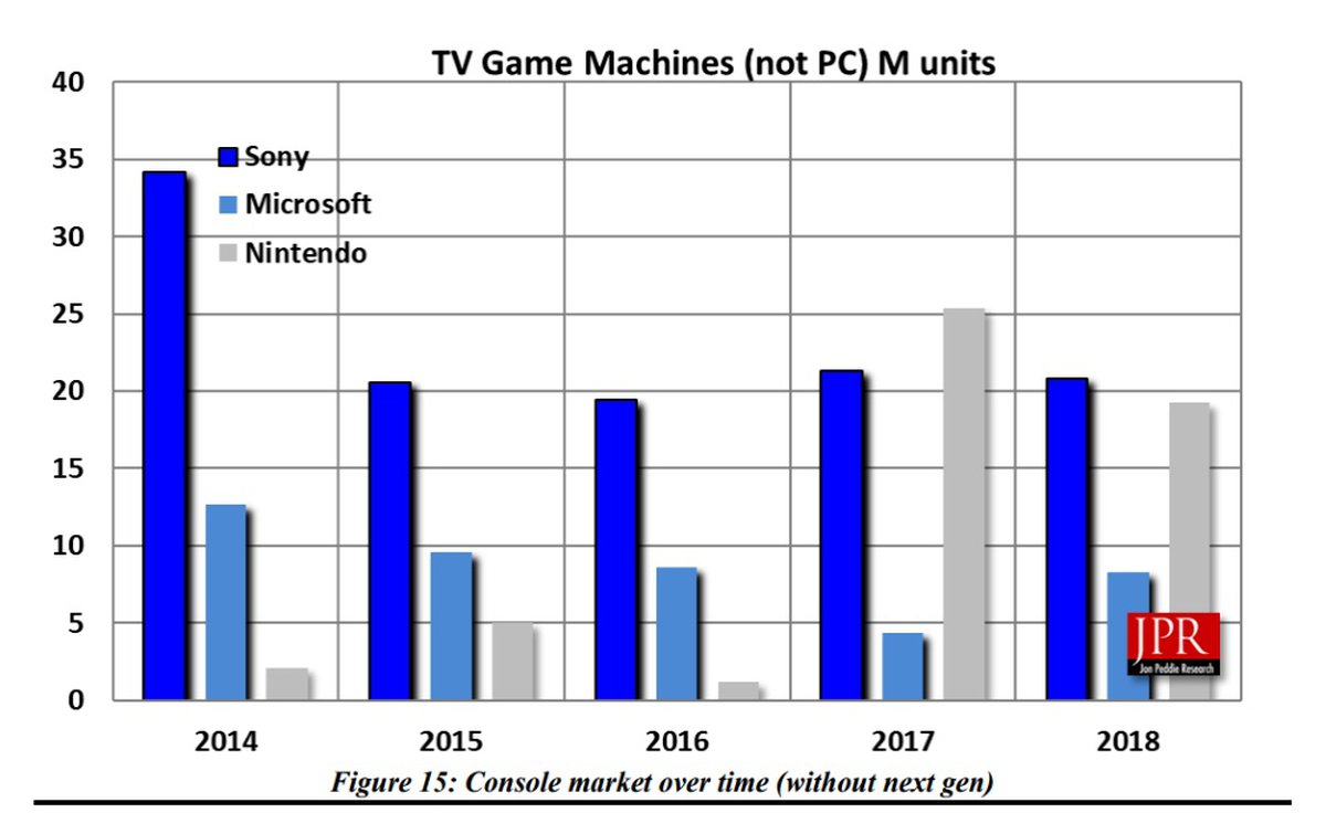 В 2018 году, полагают аналитики Jon Peddie Research, соотношение продаж останется примерно таким же. К концу года в JPR ожидают, что общее число проданных Xbox One достигнет 36.43 миллионов, продажи PlayStation 4 компания оценивает в 99.18 миллионов экземпляров.
