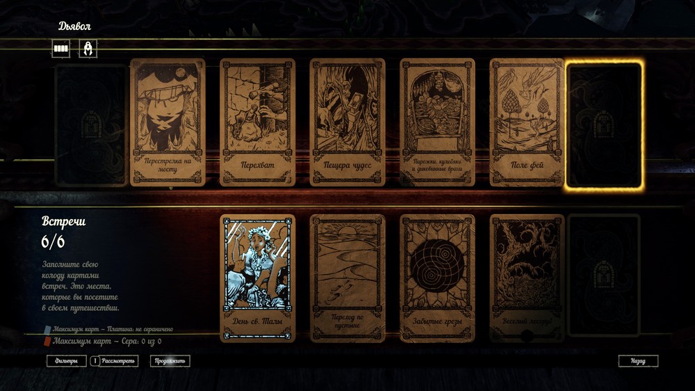 Поскольку каждое испытание является независимым приключением, то в начале новых странствий приходиться тщательно продумывать свою дорогу. Суть здесь в том, что перед каждым испытанием игрок может вложить в колоду встреч определенное число карт из своего набора, таким образом, определив те события и предметы, что будут попадаться ему на пути. Конечно, основа колоды, как и встречаемые враги, определяются непосредственно мастером игры, но та свобода, что дается игроку, позволяет подобрать набор карт, который будет максимально эффективным противовесом, уже лежащим в колоде картам. Благо перед стартом игра предупреждает о том, с какими сложностями предстоит столкнуться, и если по ходу потребуется много раз бросать кости, то выгодней взять кольцо шулера, увеличивающие результат броска на несколько пунктов. Только следует понимать, что порядок встреч и выпадения предметов может меняться, от чего наличие кольца не даст гарантии успеха, и многое зависит от выборов игрока в пути и его боевых навыков.