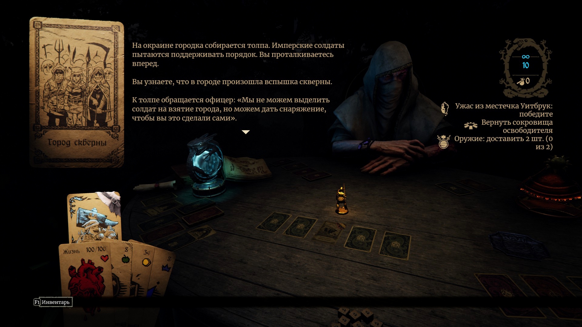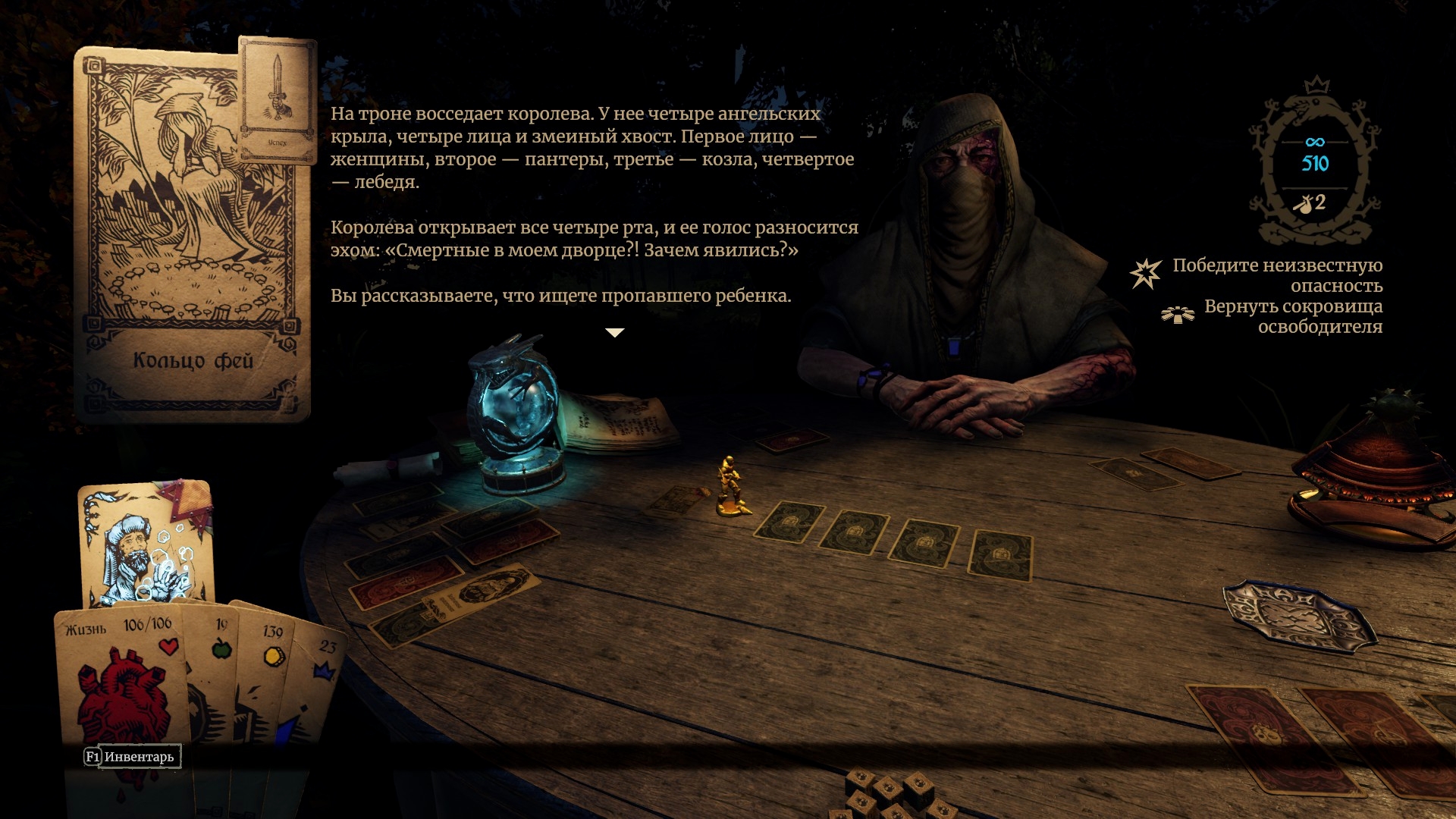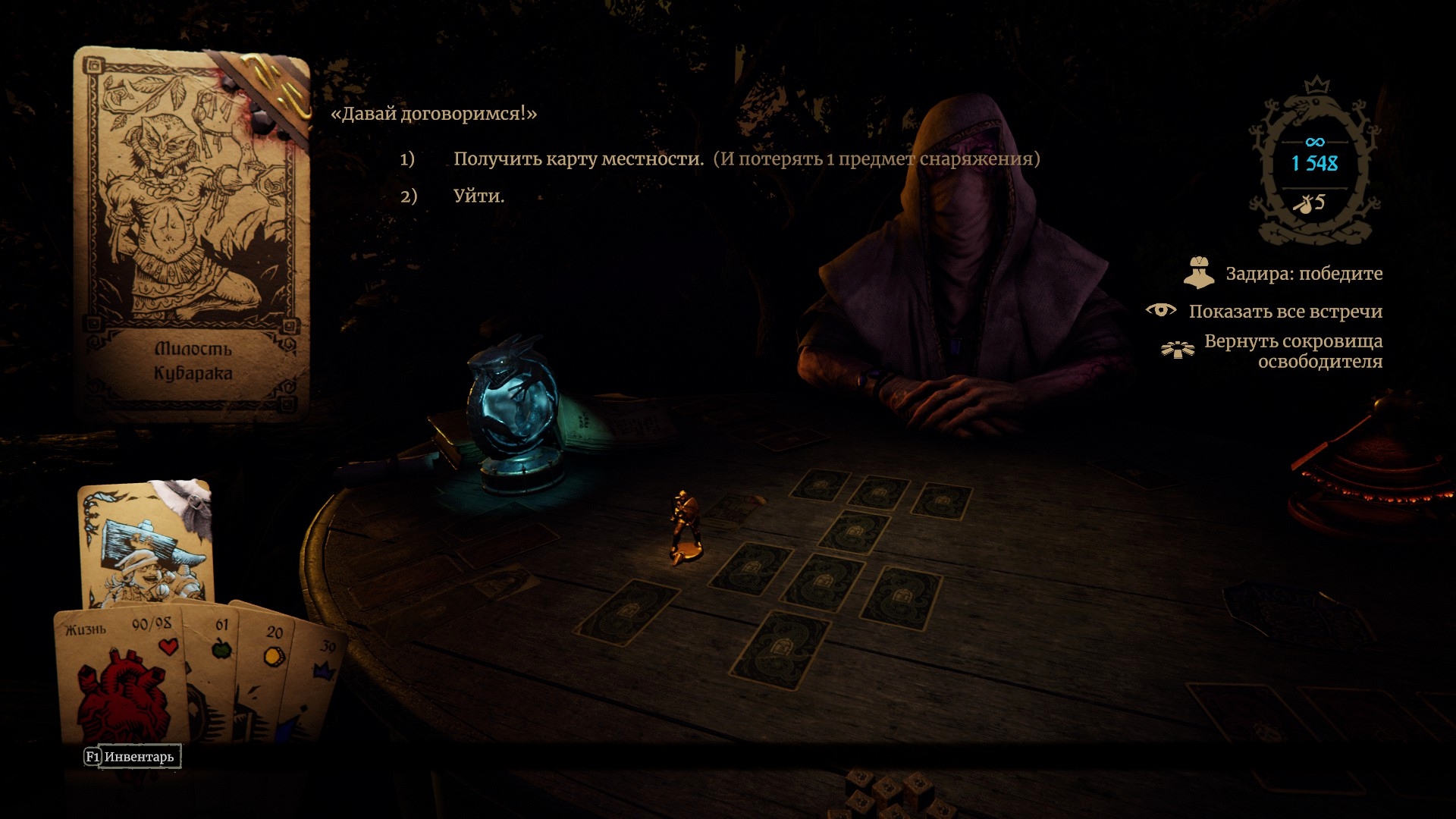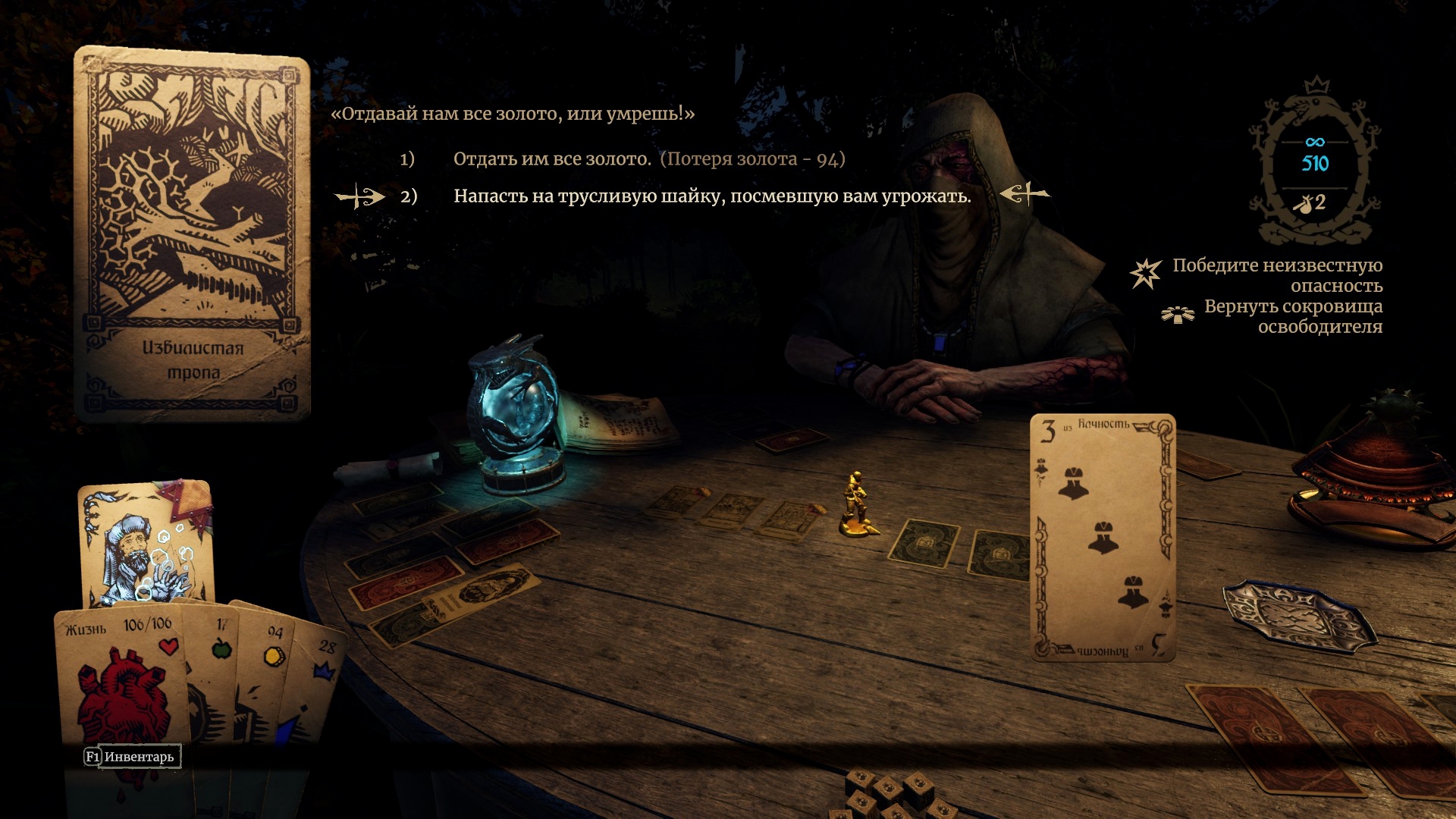 Hand of Fate 2 представляет собой активное приключение, построенное на целом ряде различных игровых механик. В основе всего лежит карточная игра, совмещенная с текстовым квестом, но помимо этого, процесс включает в себя огромный набор разнообразных действий и ситуации. Есть тут полноценная боевая система, менеджмент ресурсов и снаряжения, различные мини-игры обозначенные гамбитами, генерация событий и встреч, а также разнообразные задания. Но давайте обо всем по порядку...