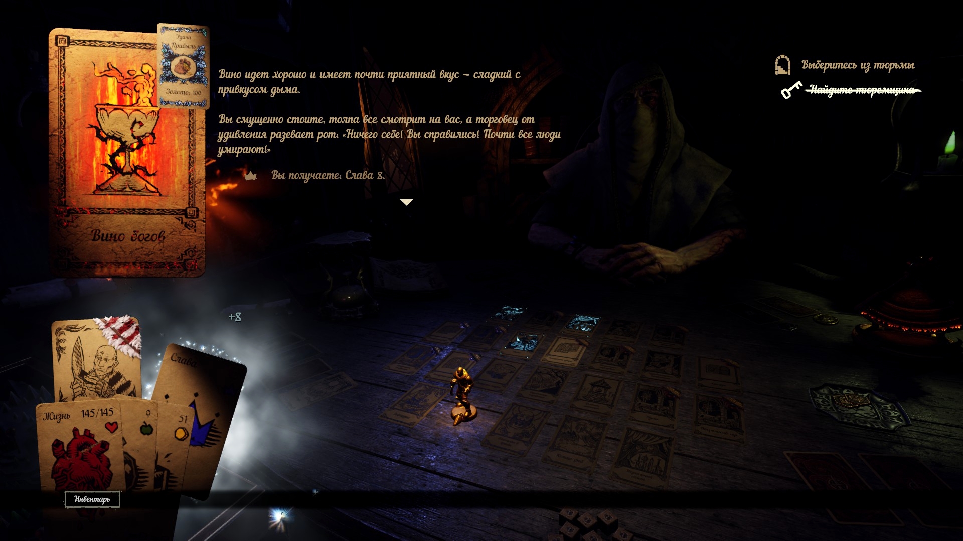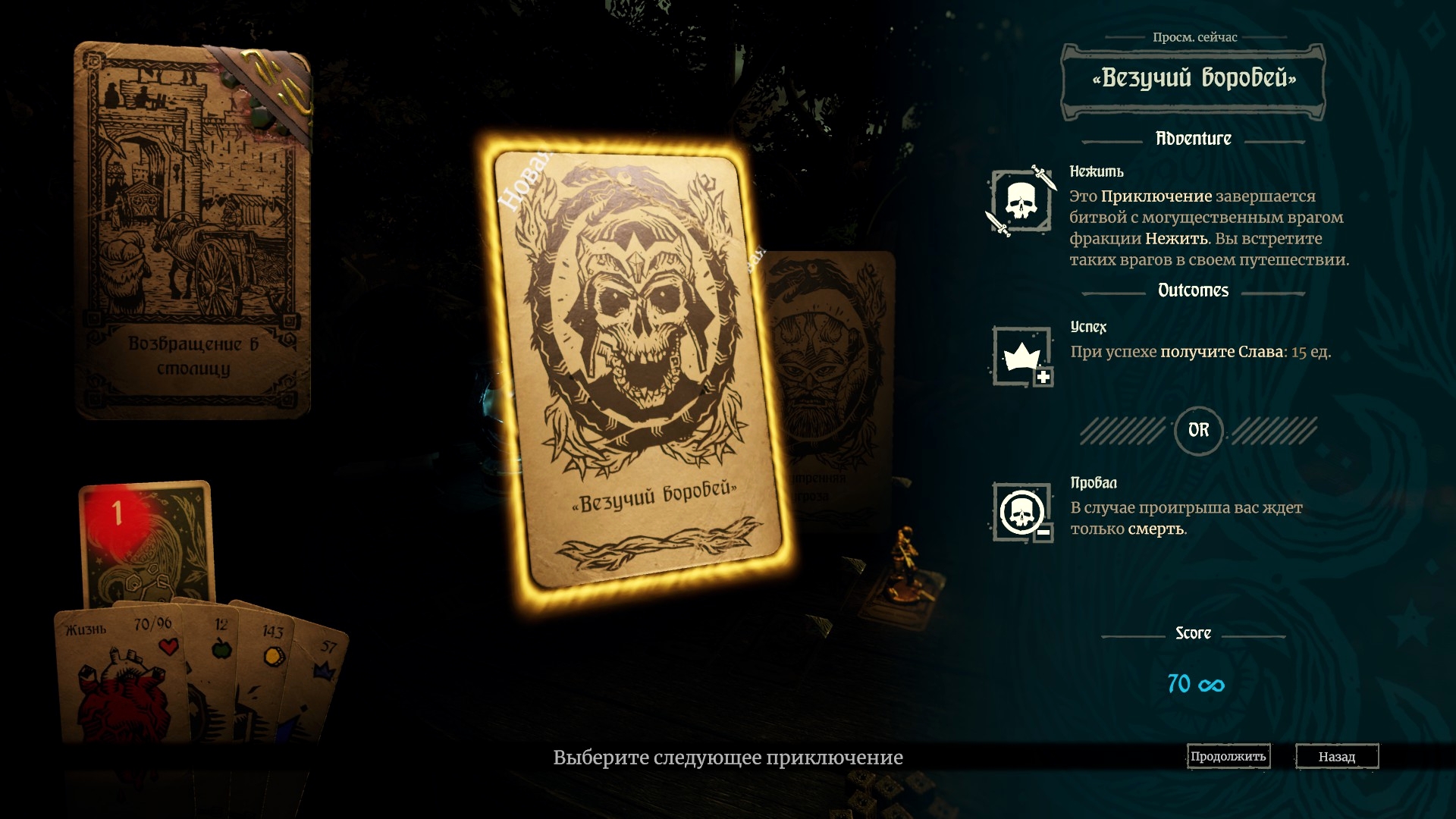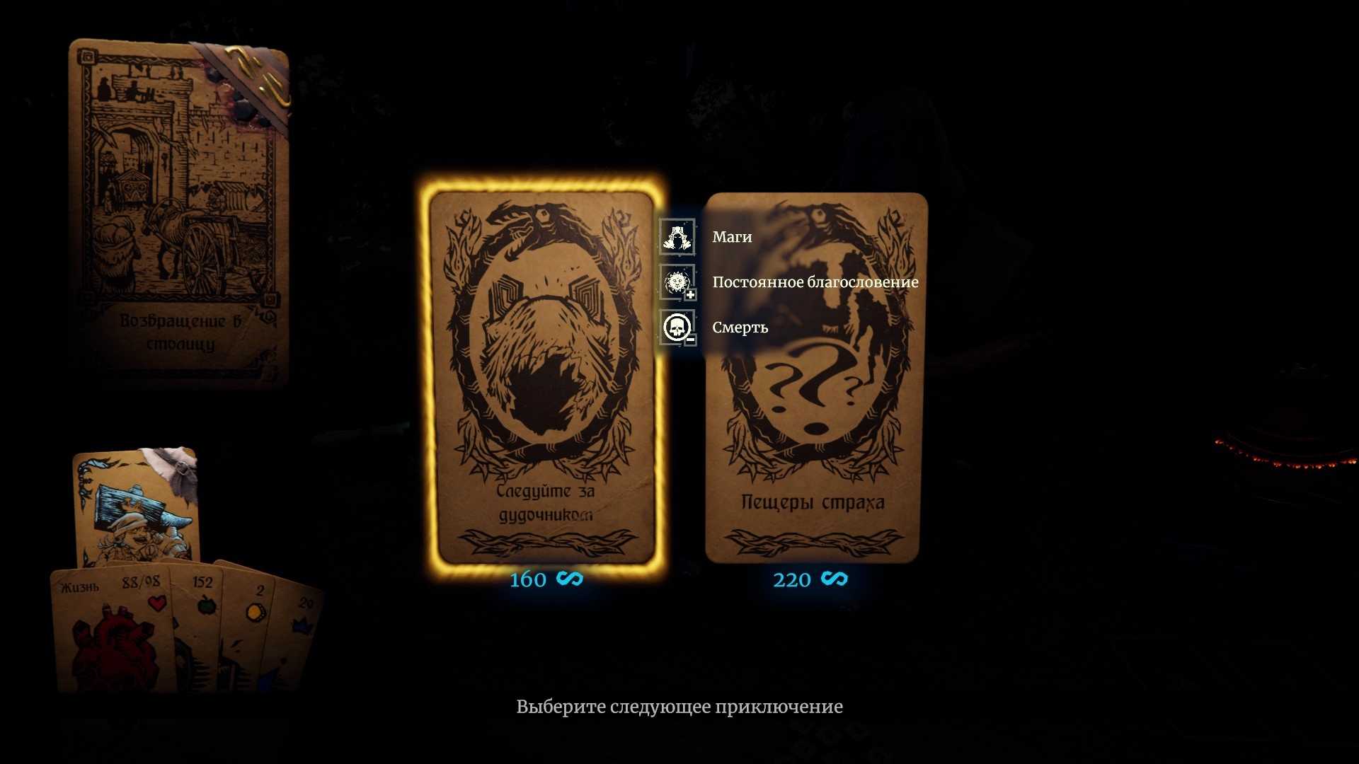 Есть и отдельные типы жетонов, которые выдаются по завершению сквозных квестов доступных в рамках любых испытаний. Например, во время встречи с базарным воришкой можно потерять золото, но если осилить гамбит с перетасовкой, то можно поймать воришку и он, оценив ловкость героя, предложит вместе грабить торговцев, что откроет доступ к новой карте с соответствующим названием. После этого можно выкрасть карту сокровищ у одного из торговцев и уже вместе с подельником отправиться на поиски клада, в рамках нового события. Таким образом, по ходу основного сюжета у игрока могут быть активными отдельные цепочки побочных квестов, полное завершение которых открывает особо ценные и качественные предметы. Последние может помочь в прохождении основной кампаний, так как сложность Hand of Fate 2 пускай и не такая высокая, как в первой части, но достаточно ощутимая на поздних этапах, из-за чего пренебрегать выполнением побочных квестовых веток не стоит.